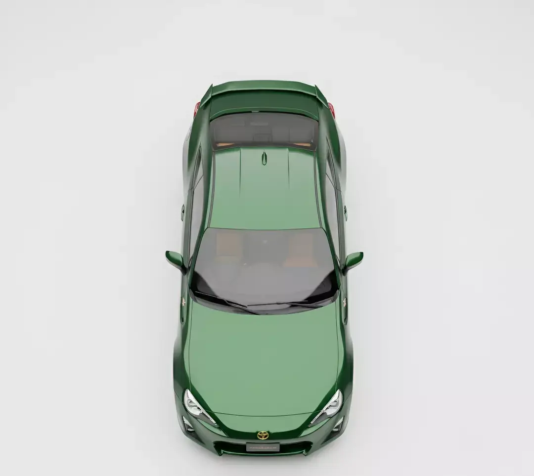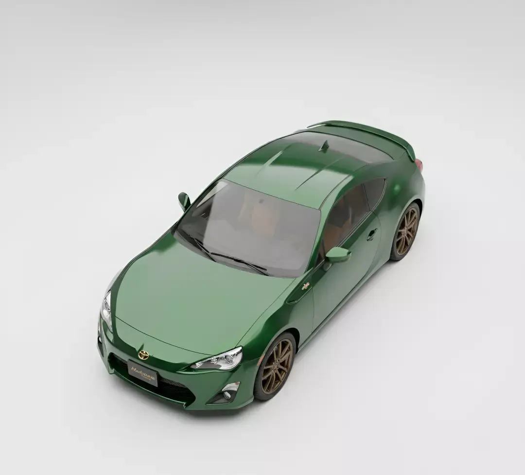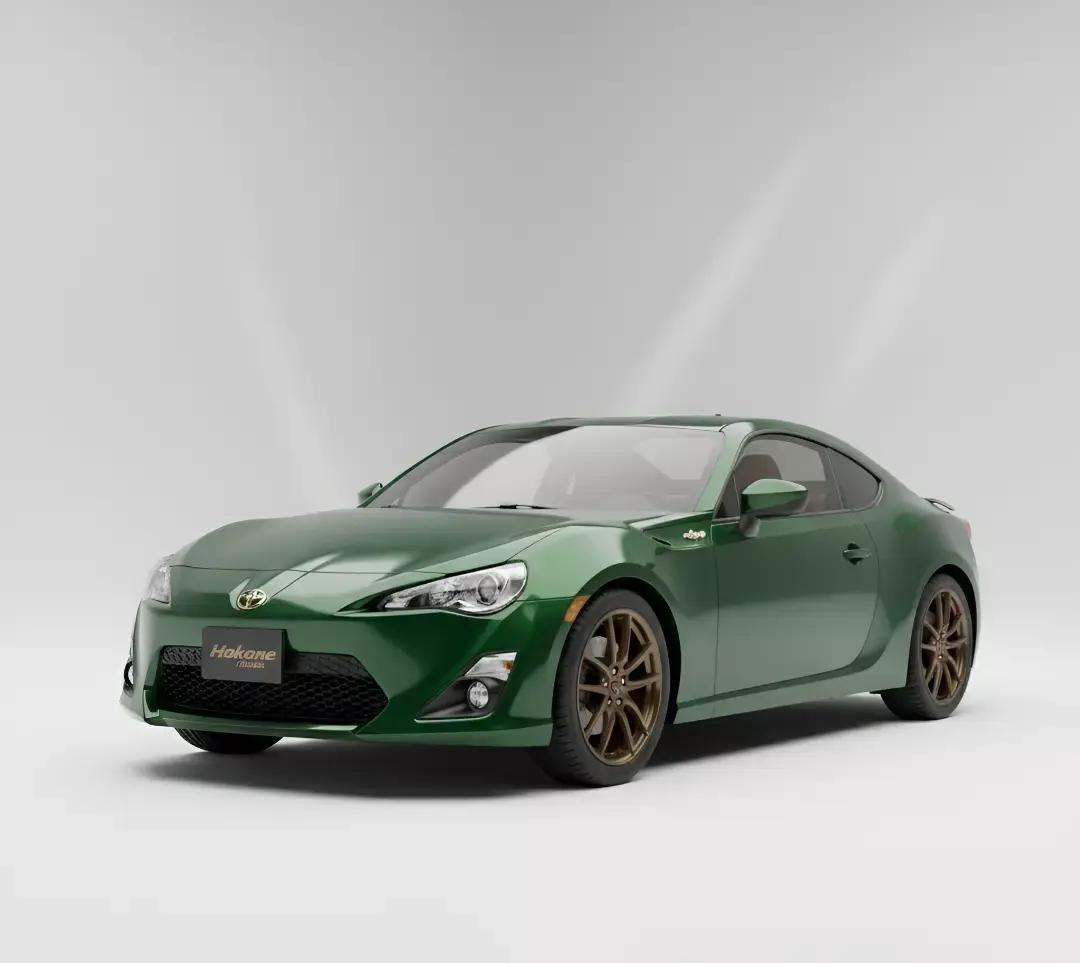 This is a high-quality 3D model render of the Toyota 86 (also known as the GT86 or Scion FR-S in different markets), specifically inspired by the rare Hakone Edition. The model showcases the distinctive, deep Hakone Green paint finish paired with matching bronze-colored wheels, giving it a unique and sporty look. The attention to detail captures the clean lines and iconic profile of the Japanese sports coupe, from the low-slung stance to the detailed badging and headlights. This render is perfect for use in automotive visualizations, game development, or as a striking portfolio piece.