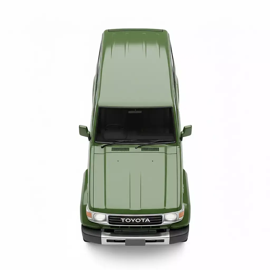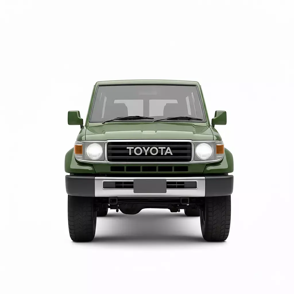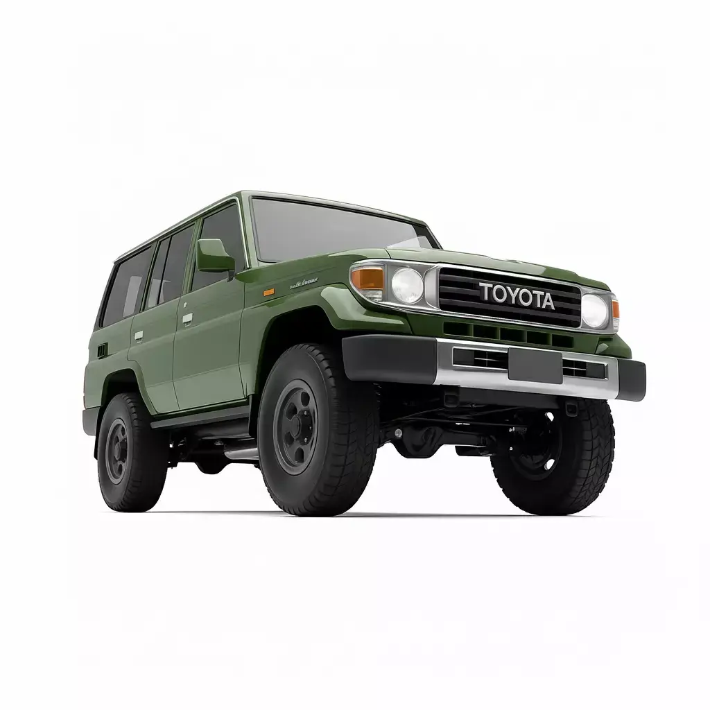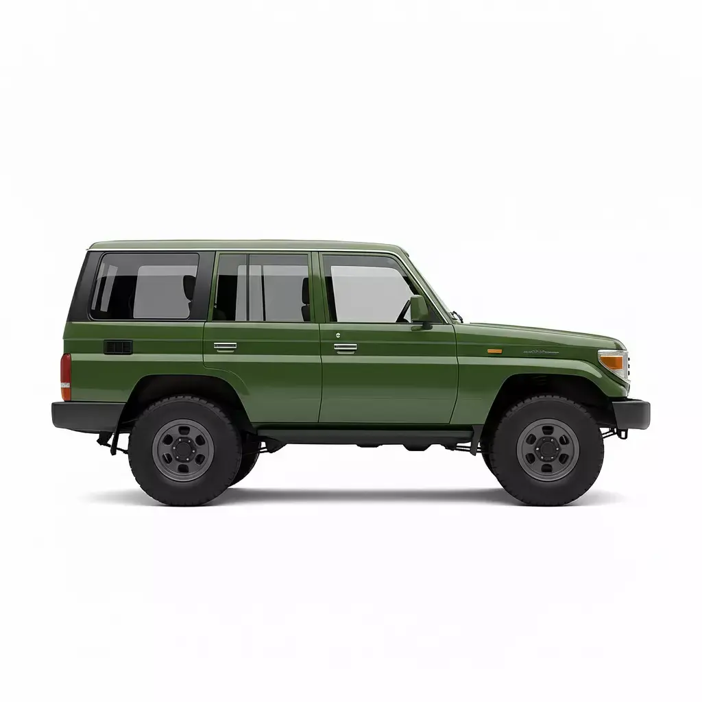 This is a detailed 3D model of a Toyota Land Cruiser 70 Series station wagon, specifically the four-door 76 Series variant, renowned globally for its rugged reliability and off-road capability. The model is finished in a timeless olive or military green paint and features a stock, four-wheel-drive setup with sturdy steel wheels and rugged tires. Key authentic details include the classic square body style, the bold TOYOTA grille, and the signature exposed door hinges. This versatile asset is perfect for visualizations set in rural, desert, safari, or adventure environments, symbolizing durability and utility.