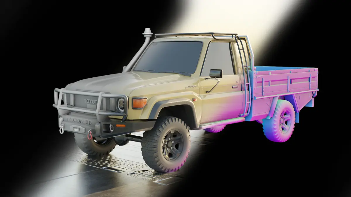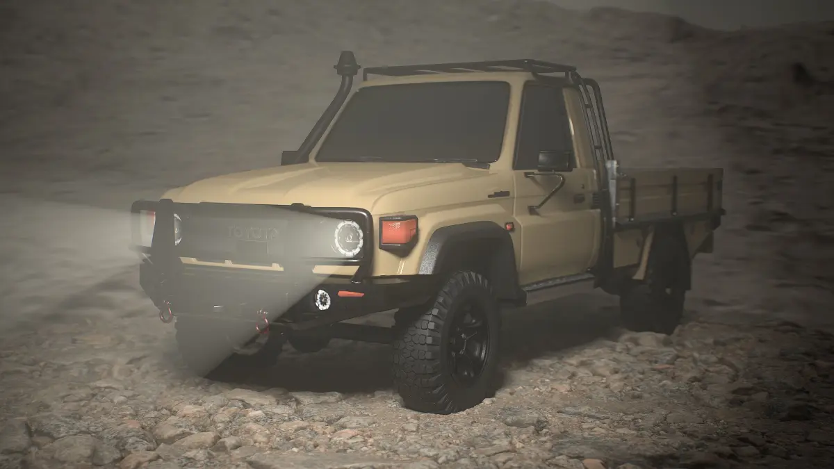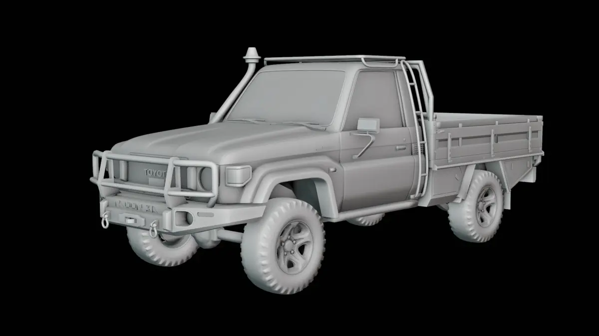 This highly detailed 3D model of a rugged off-road pickup truck is perfect for game environments, cinematic renders, or real-time simulations. Designed for maximum realism, it features a custom bull bar, snorkel, heavy-duty tires, and a reinforced tray—ideal for desert or expedition scenes.