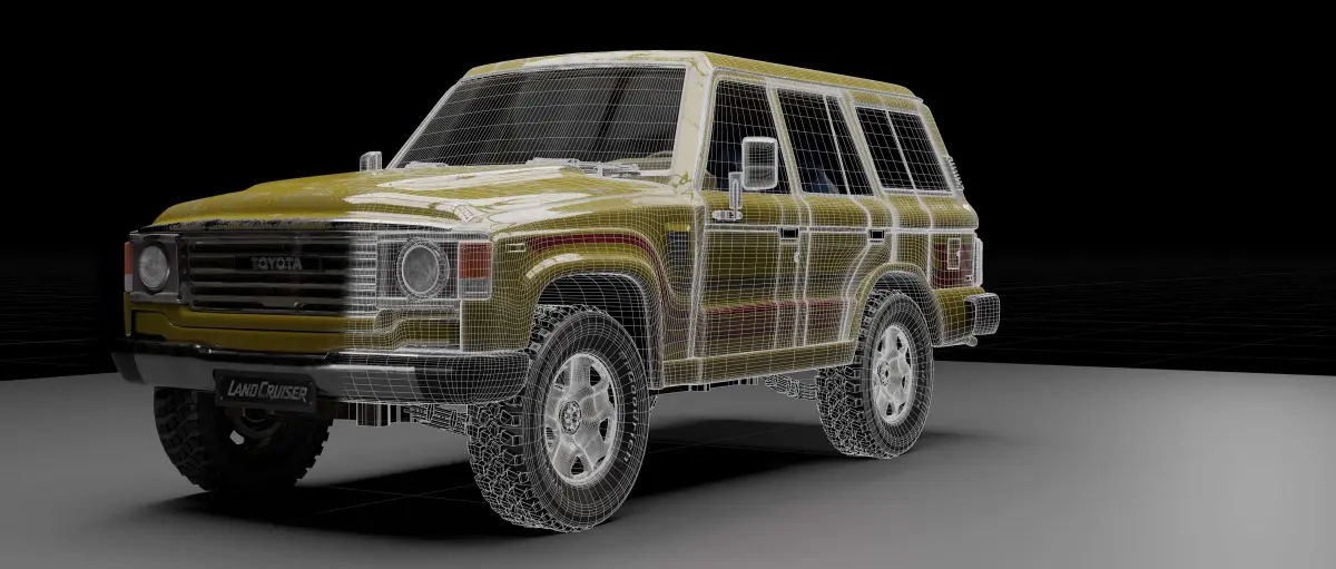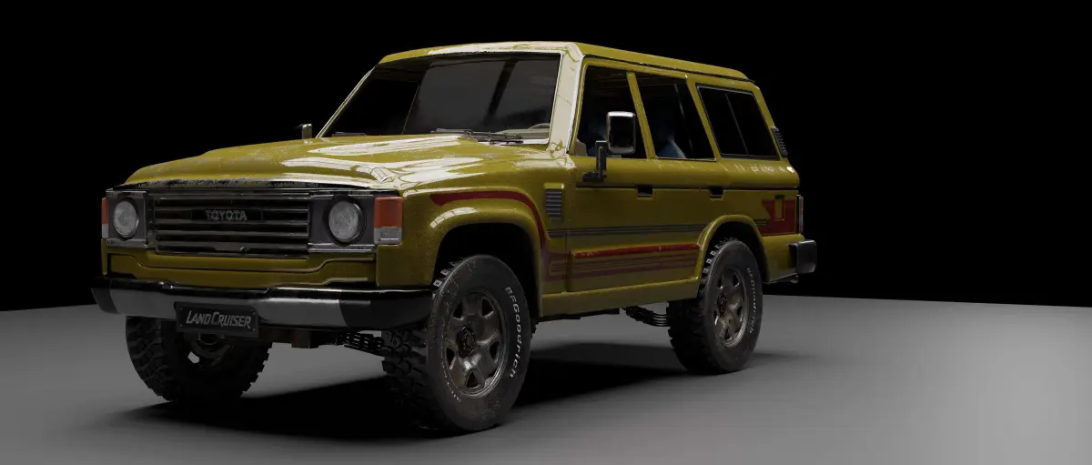 A photorealistic model of the Toyota Land Cruiser FJ60 originally introduced for the 1980 model year. Details such as the interior dashboard, steering and seats have also been included in the model. The overall texturing for the model has been made to mimic a lightly restored vehicle with some patina on various parts of the body shell that have been purposefully preserved. The trim level is non-standard however, the components are appropriate for its era of production