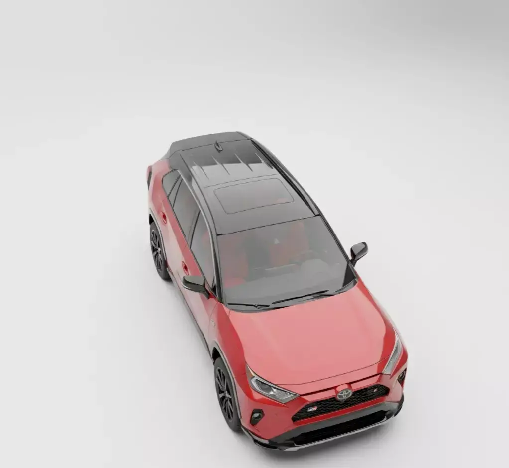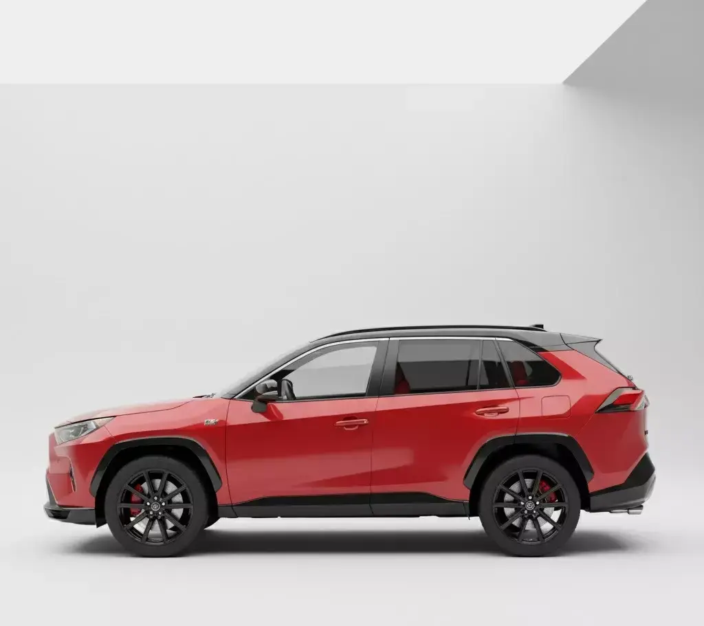 This striking front-facing shot presents the Toyota RAV4 GR Sport, exuding a powerful and sporty presence. The vehicle is finished in a vibrant, glossy red, immediately capturing attention, contrasted elegantly with a sleek black roof and matching side mirrors. Its aggressive front grille features a prominent Toyota emblem at its center, flanked by the distinctive GR badging, signifying its Gazoo Racing lineage and enhanced performance capabilities.