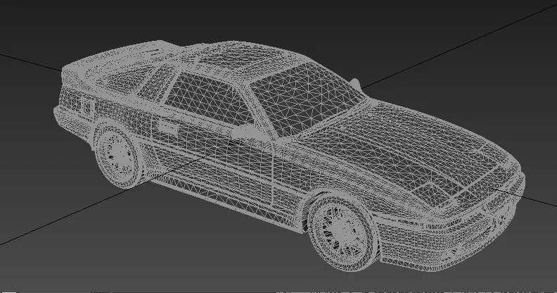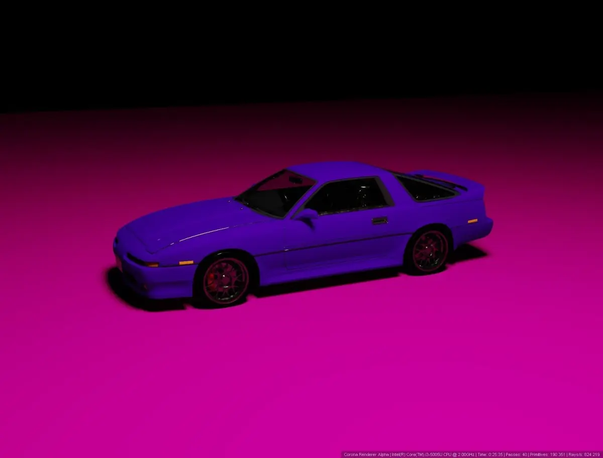A model of a retro car in the body of a Toyota Supra A70 coupe of 1989. The model has an interior with seats, a steering wheel on the right side, an analog dashboard and controls. A set of Corona Paint materials was used to create the render