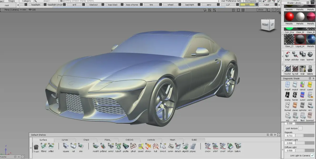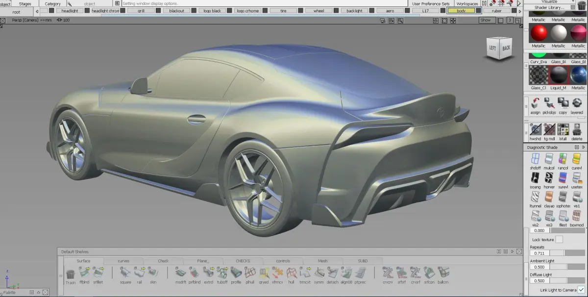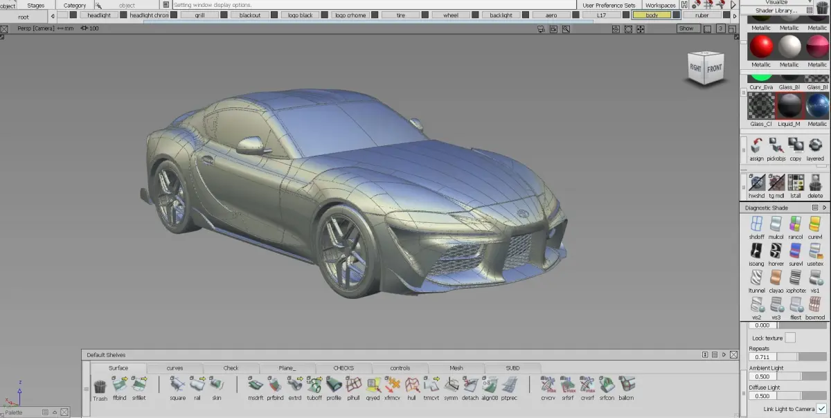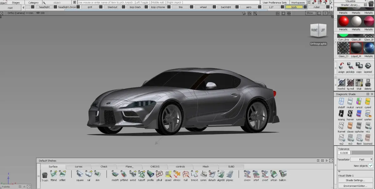 High detailed Toyota Supra 2019 exterior model. All made in Autodesk Alias with a custom shader. Very good to render or to study and analyze patches and construction.