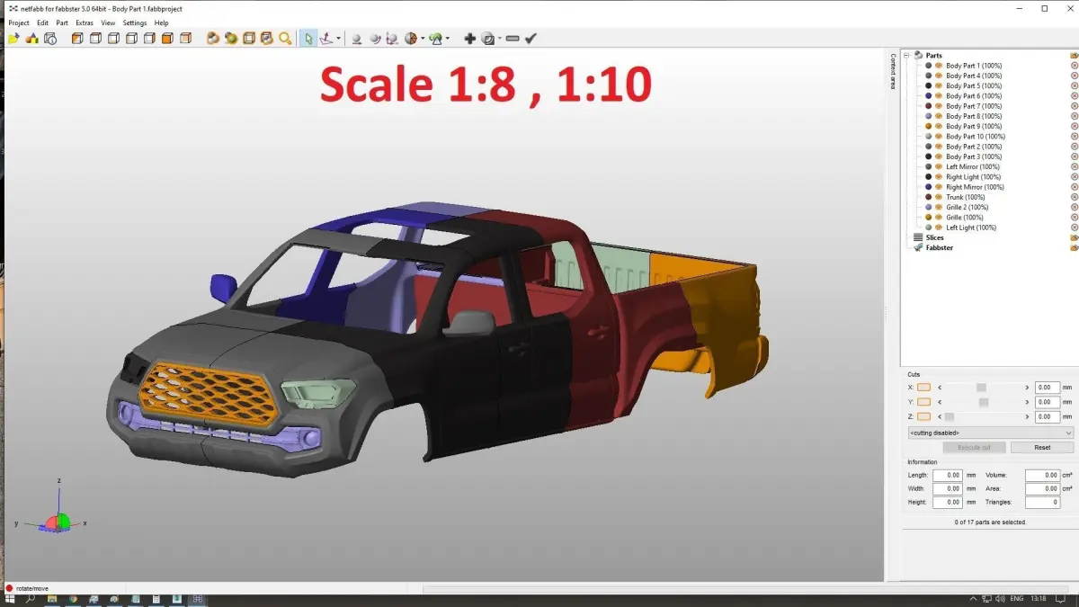 Model on a scale of 1:8 to 1:10; The body model is divided into 10 parts;grill and light separately. On a scale 1:12 , 1:18 the model is divided into 5 parts