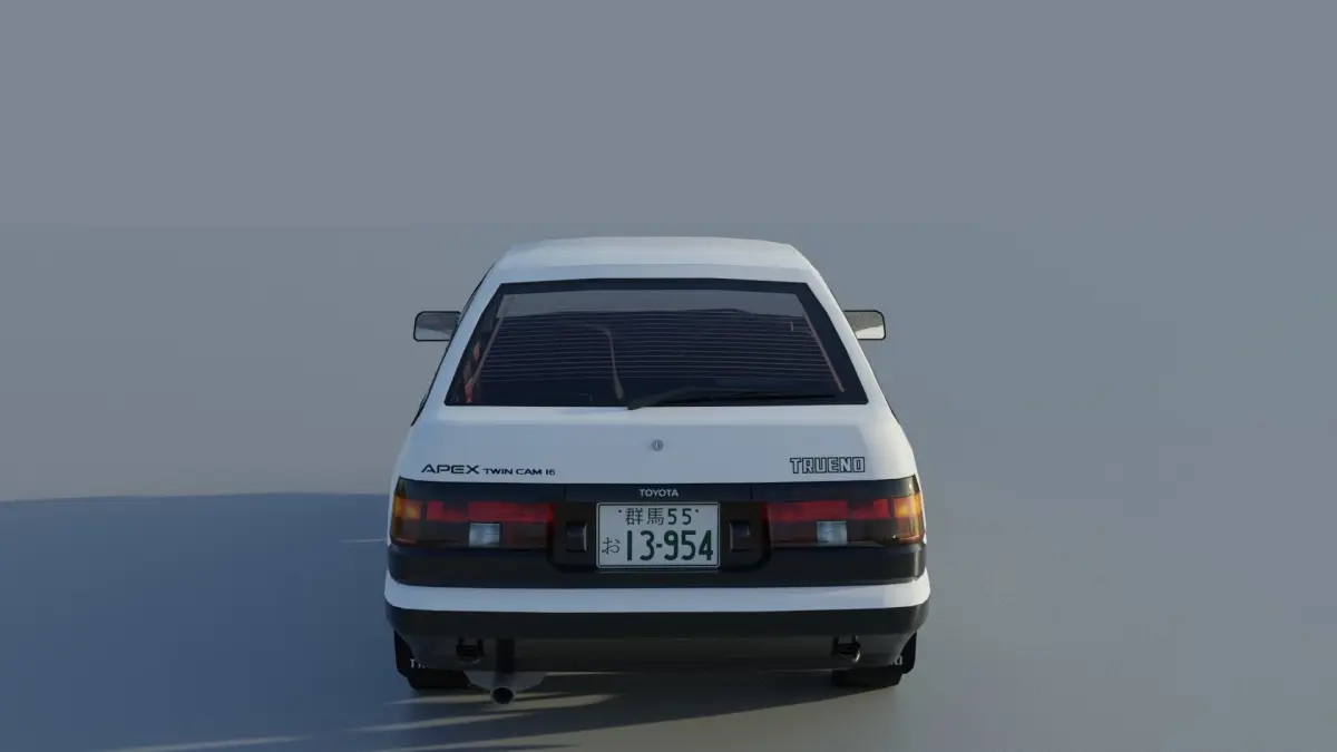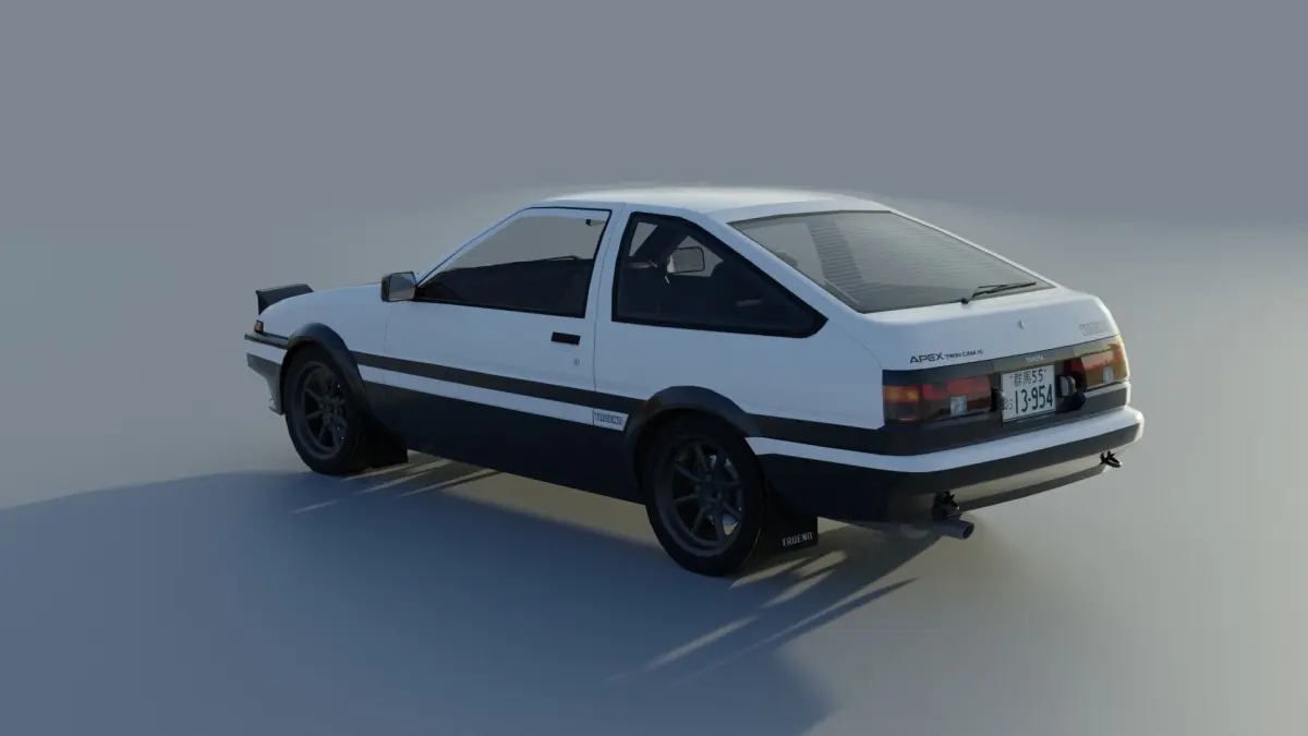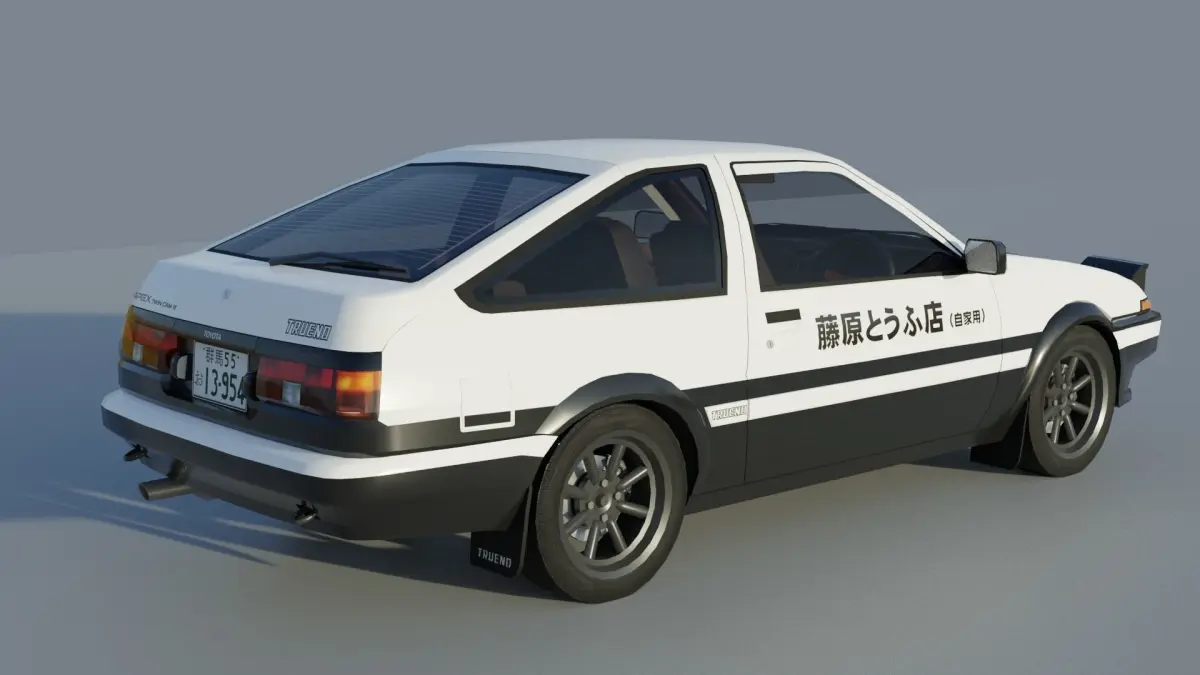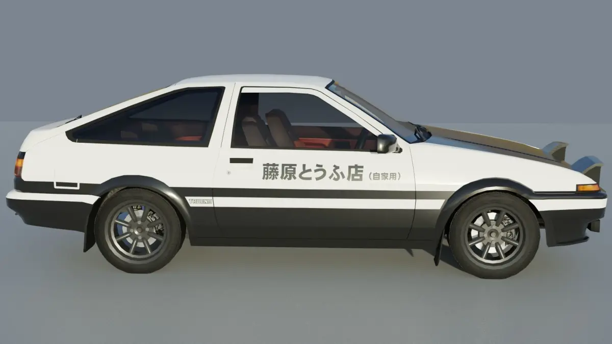 Low poly model of Toyota Trueno AE86 (Initial D stylized) with interrior. Consist of 21 correctly named parts, such as hood, front lights, wheels, doors, suspension parts etc. Model is unwraped, textures included.To close/open headlights rotate for 67 degrees on y axis.