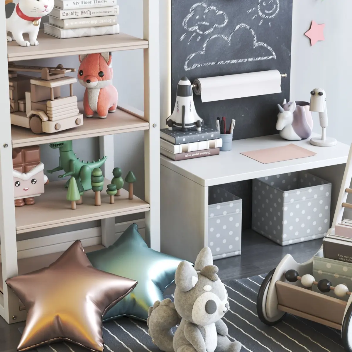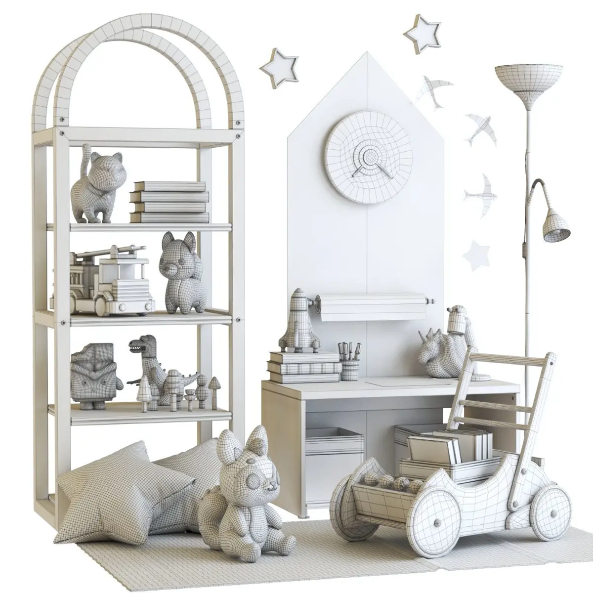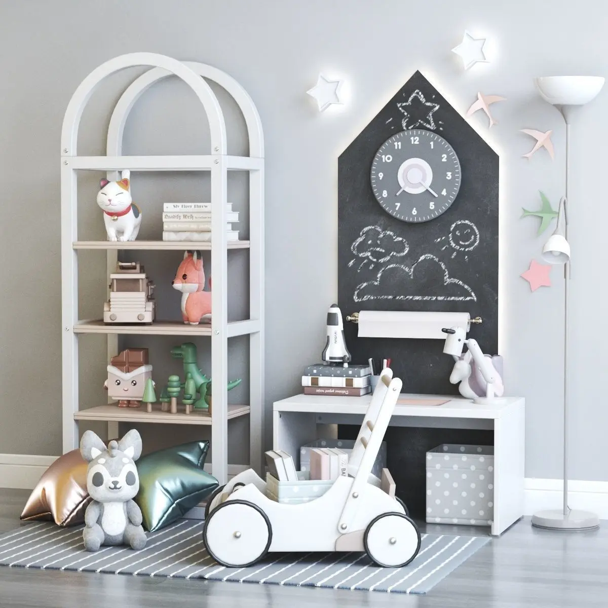 Furniture composition with shelves, toys and decor for the nursery.
