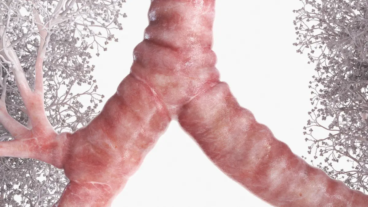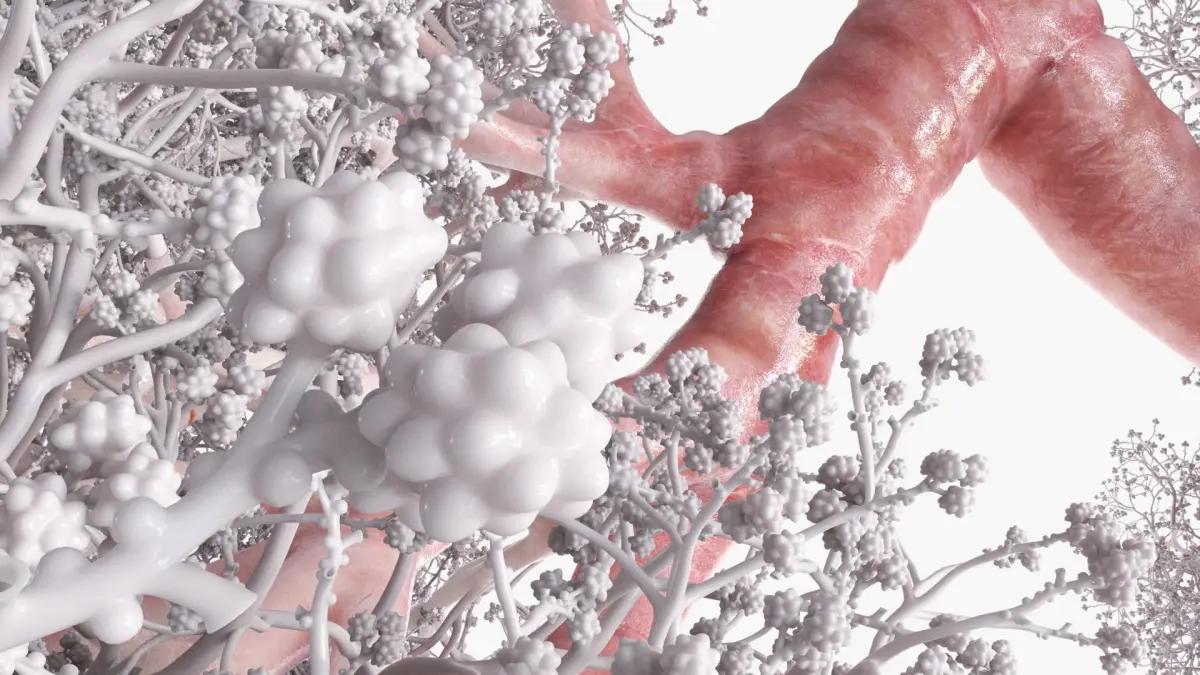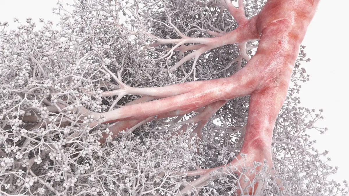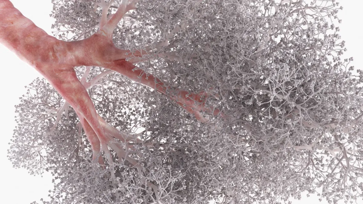 The scene includes the trachea mesh and 890 instanced alveoli, making the scene 40 MB light and allowing it to render within a few minutes.