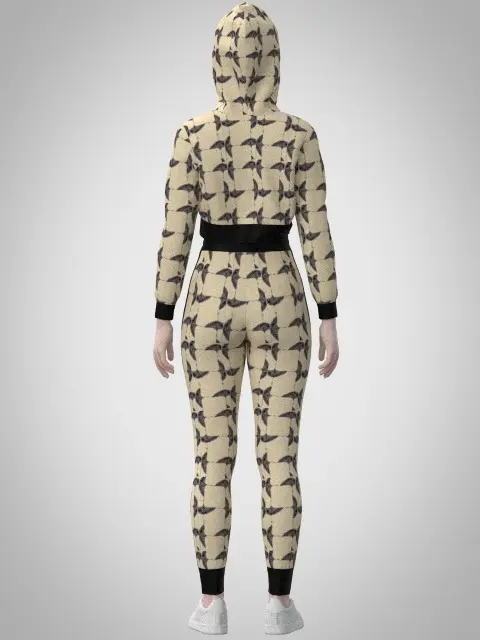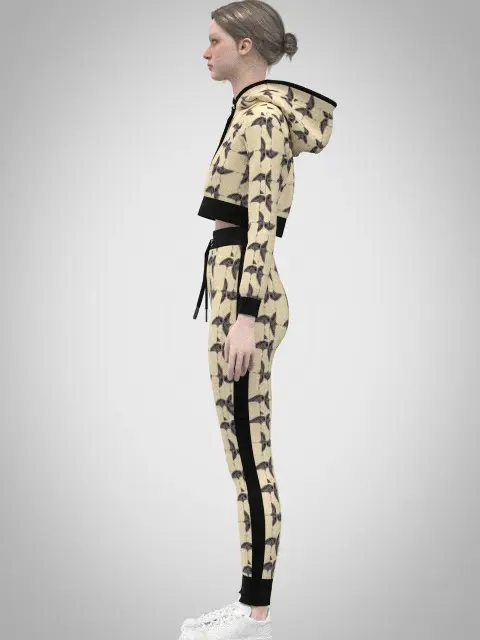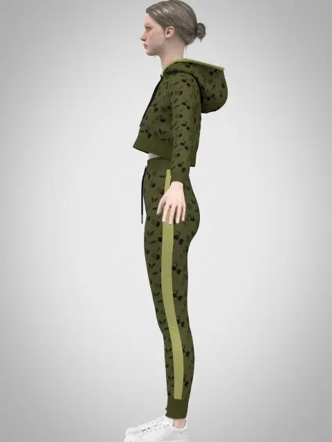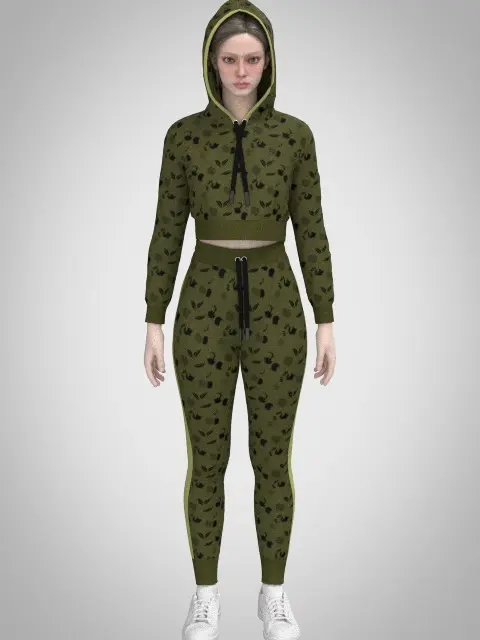 Two Color Variants:Beige with a bold, dynamic pattern.Olive green with a subtle, sporty leaf motif.Activewear Design: A fitted cropped hoodie with drawstrings and matching joggers featuring side stripe details and elastic cuffs for a sleek, athletic look.Accurate Construction: Developed with precise patterns to reflect real-world activewear design and functionality.High-Resolution Textures: Includes 4K PBR textures to deliver premium visual quality.Available Formats: OBJ, FBX, MARVELOUS DESIGNER (.Zprj), CLO3D, and GLB for use in a variety of projects.Perfect for showcasing activewear collections, virtual fashion simulations, or character outfits, this 3D model offers a contemporary and versatile solution for your creative needs. Download now to bring your vision to life!