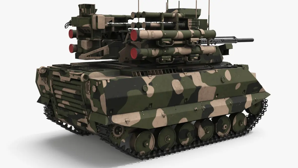 This model features a robust design with camouflage paint, showcasing multiple missile launchers and a mounted cannon for intercepting airborne threats. The vehicle’s heavy armor provides protection from small arms fire and shell fragments, while its tracks enable maneuverability across various terrains. It also includes advanced targeting systems and radar equipment for precision engagement.