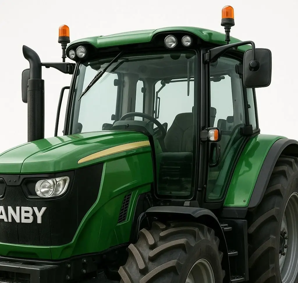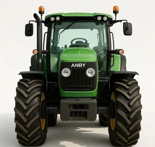 A stylized 3D model of a modern agricultural tractor, featuring a vibrant green body with bright yellow wheels and accents. The tractor has oversized, knobby tires, a spacious cabin with large windows, and visible details like headlights, exhaust pipe, and warning lights. The design has a slightly cartoonish or simplified aesthetic with smooth surfaces and clear shapes, making it appealing for a younger audience or casual game environments. The model is presented against a plain white background, emphasizing its cheerful and approachable design. This model is ideal for children's educational content, casual farming games, or stylized agricultural visualizations.