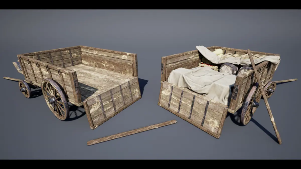 Trader Carriage. Fully rigged. The product includes mask textures for creating costomizable materials, namely the tint control. The Images rendered in the Unreal Engine 5. The Project Includes 512-4K textures: Base Color, Normal and PBR Workflow Texure: AO, Roughness, Metallic. (AO_R_M Texture).Background is not included.The Pack includes 7 variants of the market carriage: