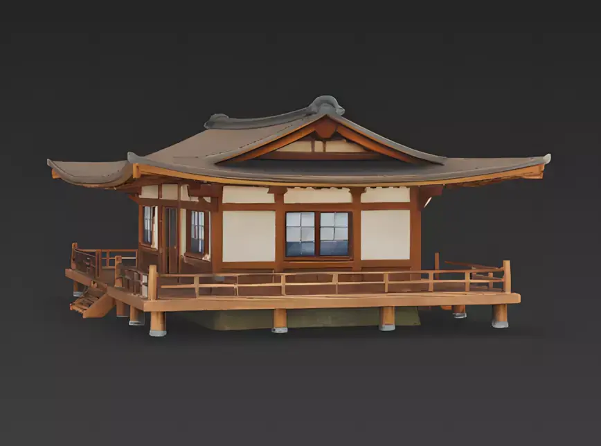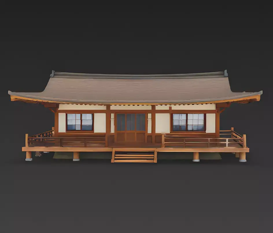 Raised Wooden Veranda The house sits on a raised platform supported by small pillars, keeping it off the ground. A beautiful wooden deck (or engawa) wraps around the front, enclosed by a simple railing, offering a perfect spot for characters to sit and enjoy the view.