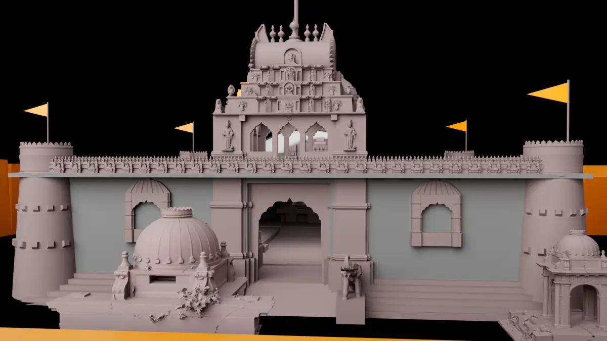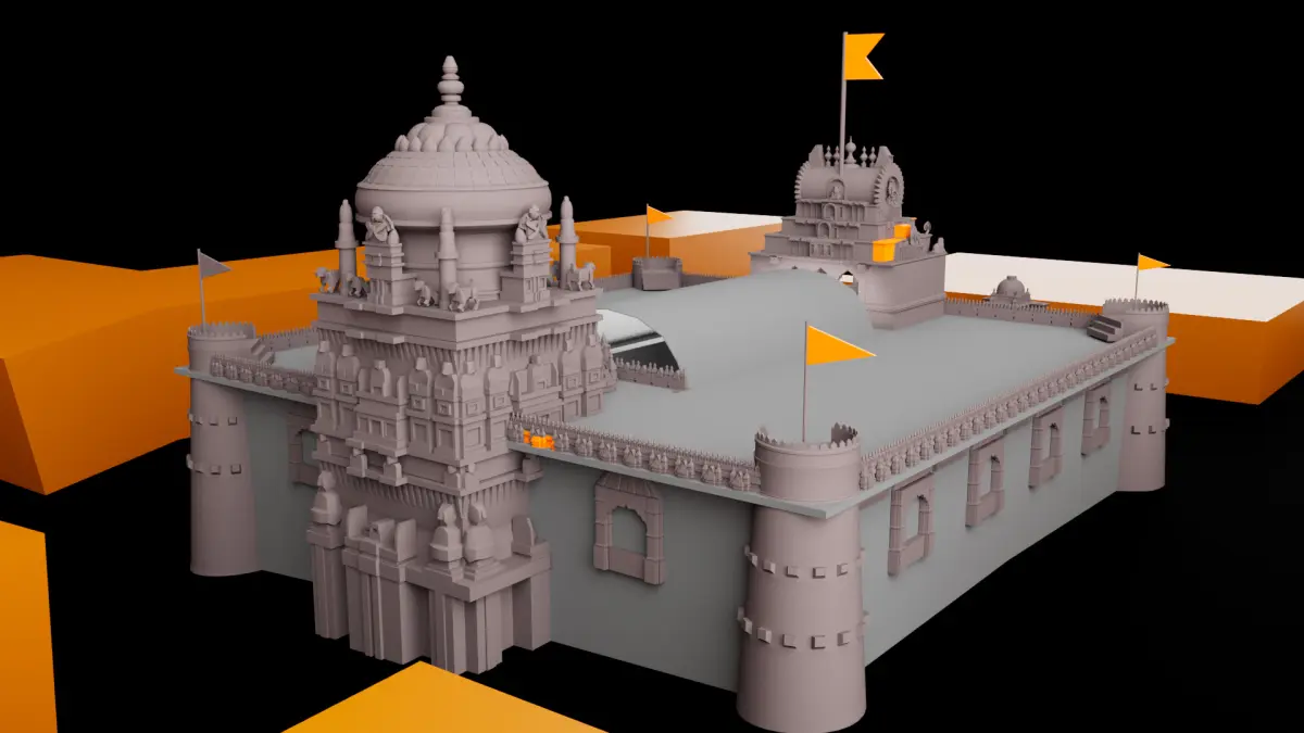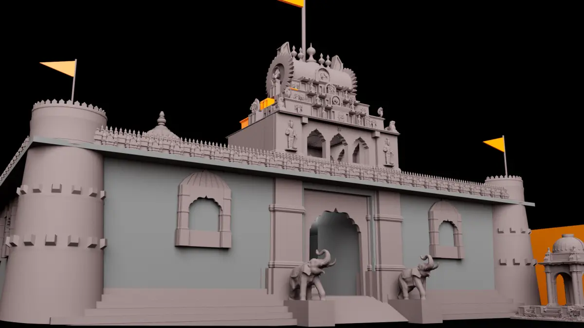 Traditional Balaji Temple - 3D Architectural ModelThis intricately crafted 3D model represents a traditional Indian Balaji temple architecture, blending heritage design with digital precision. Inspired by ancient Indian craftsmanship, the structure highlights authentic elements such as sculpted domes, ornate carvings, elephant guardian statues, and flag-topped shikharas (spires).