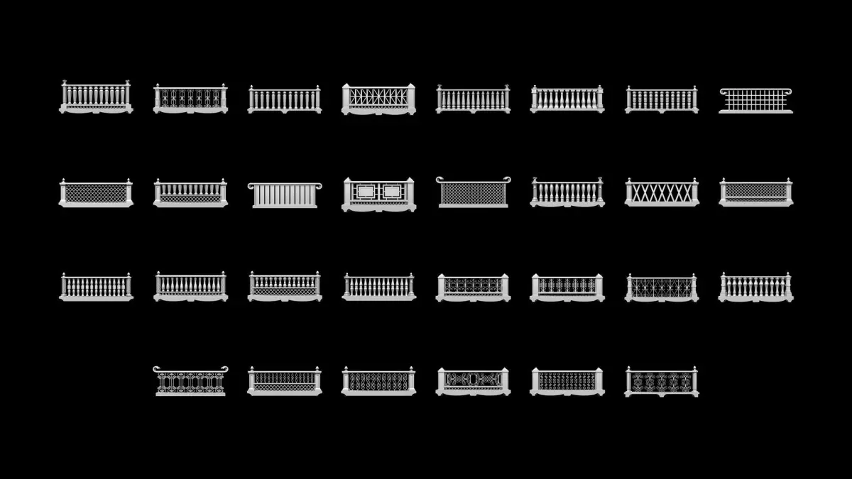 This pack includes 30 traditional balcony railings 3d models as a base mesh to add more detail to your 3d projects.