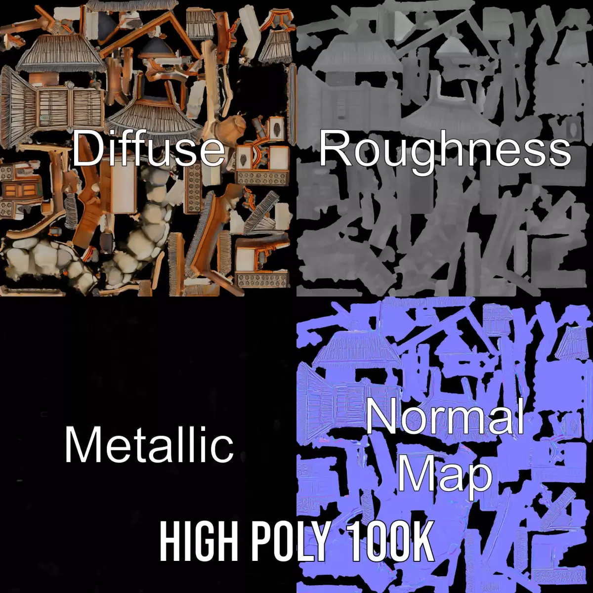 This Traditional Bamboo Hut model pack captures the essence of rustic island living with intricate wooden detailing and a charming thatched roof design. Ideal for tropical scenes, architectural visualization, or cultural demonstrations. Each model has 3 levels of detail: low-poly (1000 triangles for mobile), middle-poly (10,000 triangles for environment), and high-poly (100,000 triangles), which allows for the use of this model in production rendering (such as 3ds Max, Maya, Cinema 4D, Blender, Vray, Corona, Cycles, and others), game engines (Unity and Unreal compatible), and interactive presentations, providing a choice of detail based on the LOD System principle. The model's textures are PBR, Diffuse, NormalMap, and reflection/roughness/metallic, which are suitable for any modern rendering engine. All models accurately unwrapped and have no overlapping UV. Perfect for enhancing virtual environments with authenticity and detail. All textures are 4096*4096 in size.