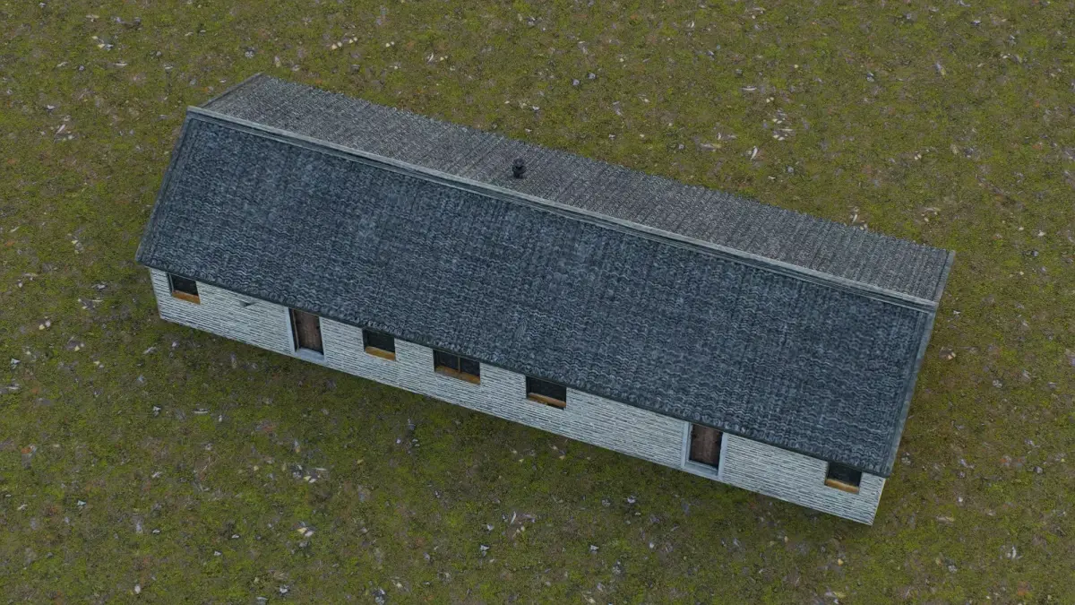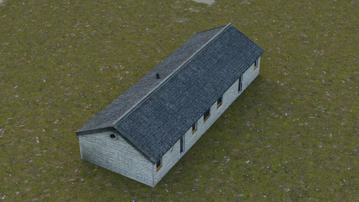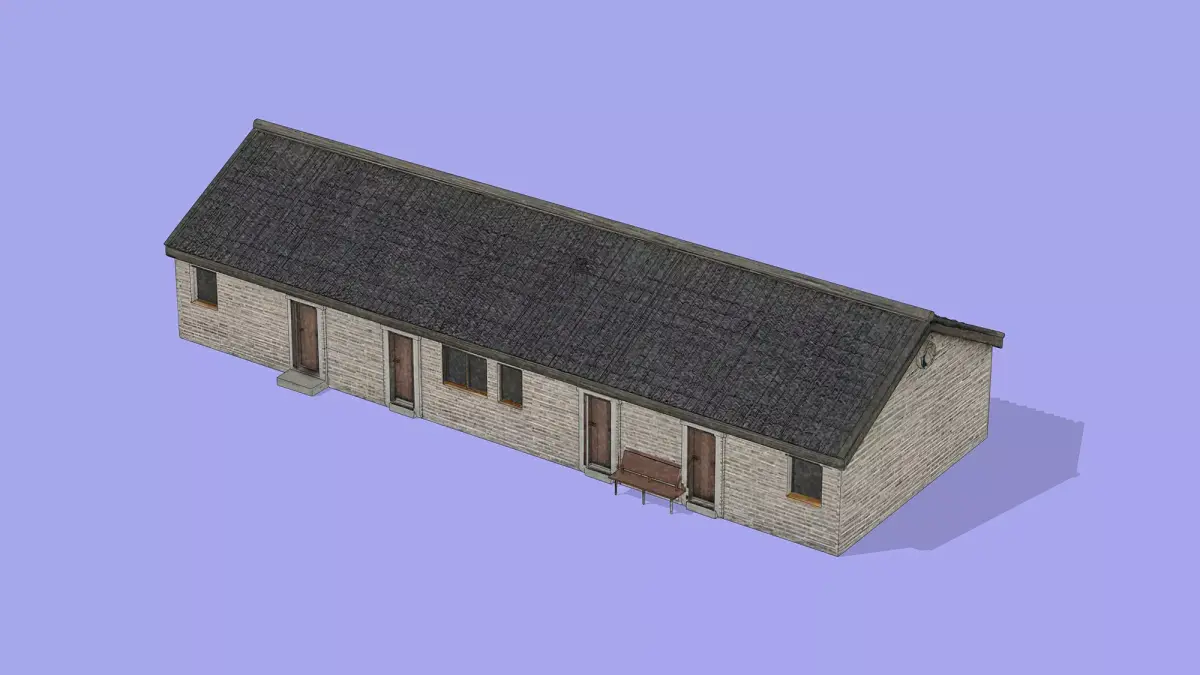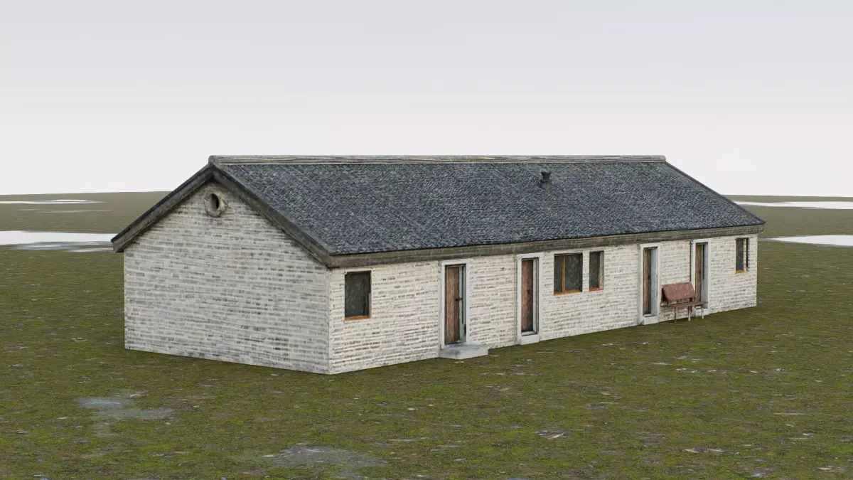 This 3D low-poly model represents a traditional Chinese rural house, reflecting the architectural style commonly found in countryside regions across China. Constructed with simple yet functional design principles, the building features a single-story structure with a gabled roof covered in dark grey tiles, typical of vernacular architecture in temperate climates. The walls are made of whitewashed brick or rammed earth, providing durability and thermal insulation. The layout includes multiple doors and windows for ventilation and natural light, while a small wooden bench placed outside suggests everyday rural life. This low-polygon model captures essential architectural details with minimal geometry, making it ideal for use in virtual environments, simulations, or digital storytelling projects focused on cultural heritage and regional landscapes.