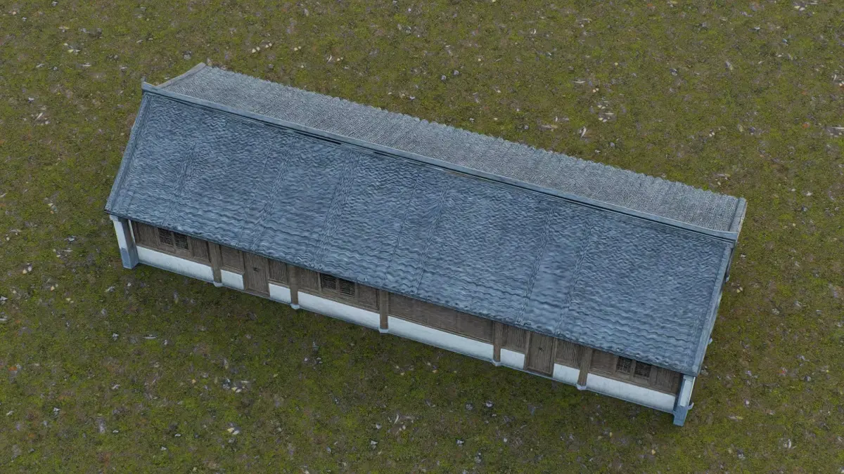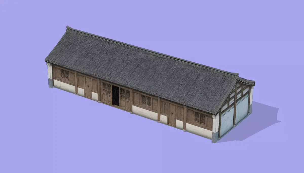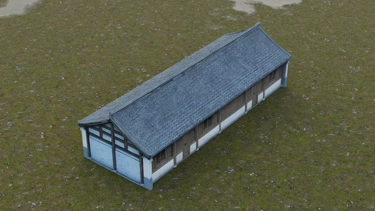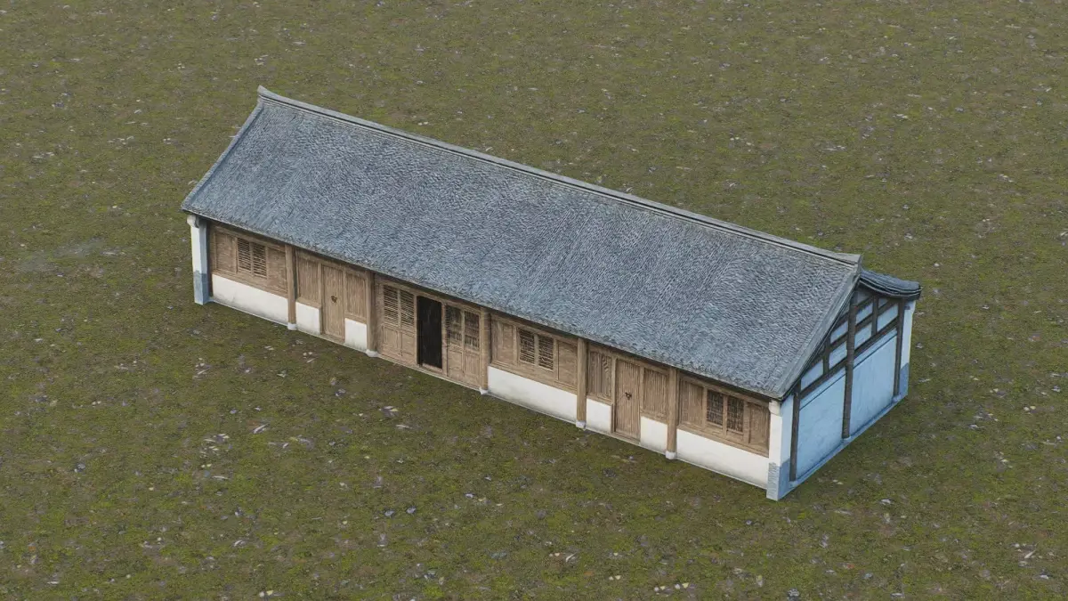 This 3D low-poly model represents a traditional Chinese rural house, reflecting the architectural style commonly found in countryside regions across China. Constructed with simple yet functional design principles, the building features a single-story structure with a gabled roof covered in dark grey tiles, typical of vernacular architecture in temperate climates. The walls are made of whitewashed brick or rammed earth, providing durability and thermal insulation. The layout includes multiple doors and windows for ventilation and natural light, while a small wooden bench placed outside suggests everyday rural life. This low-polygon model captures essential architectural details with minimal geometry, making it ideal for use in virtual environments, simulations, or digital storytelling projects focused on cultural heritage and regional landscapes.