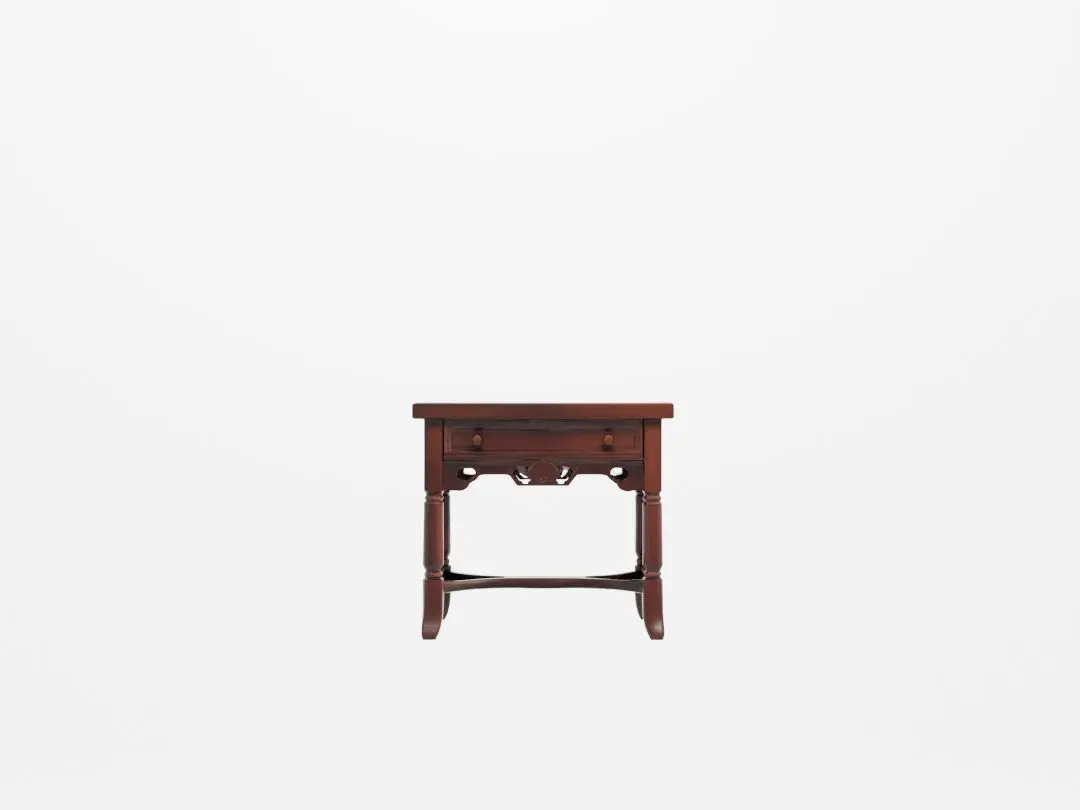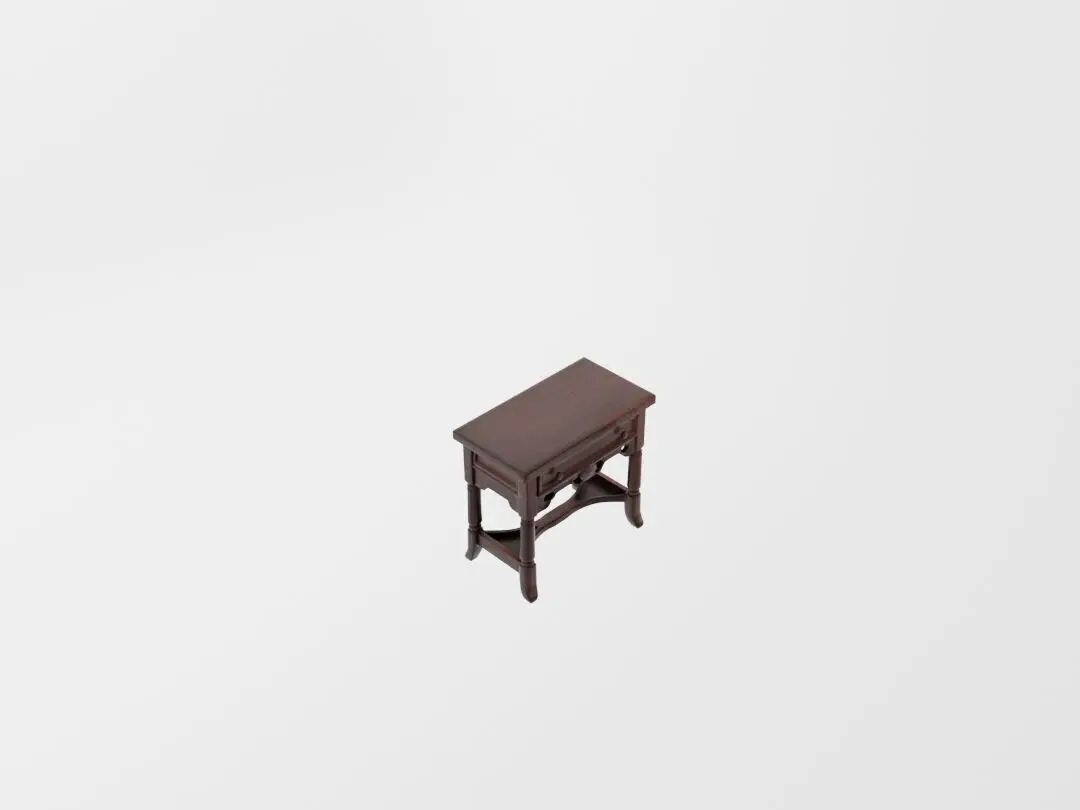 A simple yet charming dark wood side table with traditional carved details and turned legs. This model features a single drawer and decorative support bars, making it suitable for classical-themed interiors or vintage-inspired game scenes. While the details are stylized and not highly realistic, the table works well as a background or filler prop.