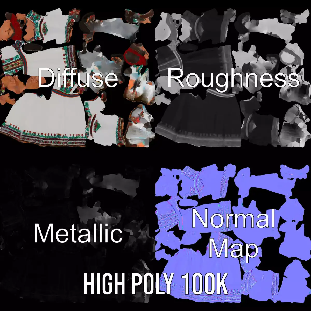 This 3D model pack features a beautifully detailed traditional embroidered dress, perfect for historical or cultural visualizations. The intricate embroidery and authentic design make it ideal for use in fashion simulations, cultural projects, or animated storytelling.