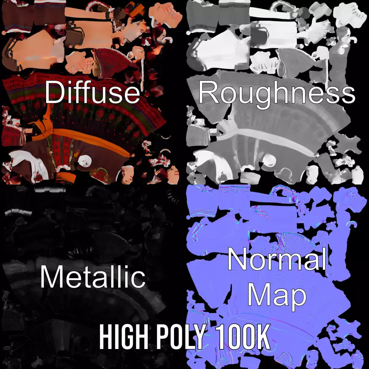 This Traditional Folk Dress model captures intricate embroidery and vibrant colors, ideal for cultural scenes or historical recreations. Each model has 3 levels of detail: low-poly (1000 triangles for mobile), middle-poly (10,000 triangles for environment), and high-poly (100,000 triangles), allowing for use in production rendering (such as 3ds Max, Maya, Cinema 4D, Blender, Vray/Corona/Cycles), game engines (Unity and Unreal compatible), and interactive presentations, providing a choice of detail based on the LOD System principle. Perfect for virtual fashion shows, costume design concepts, and educational projects. The model's textures are PBR, Diffuse, NormalMap, and reflection/roughness/metallic, suitable for any modern rendering engine. All models are accurately unwrapped with no overlapping UVs. All textures are 4096*4096 in size. Please like and leave a comment if you enjoyed this model.