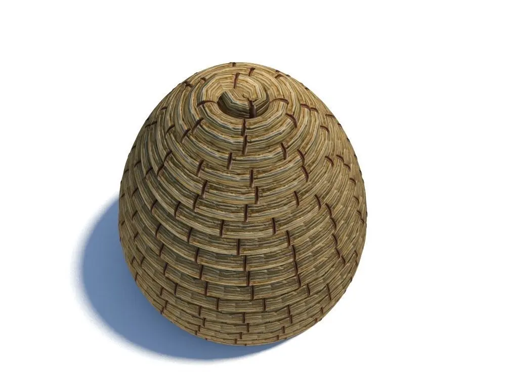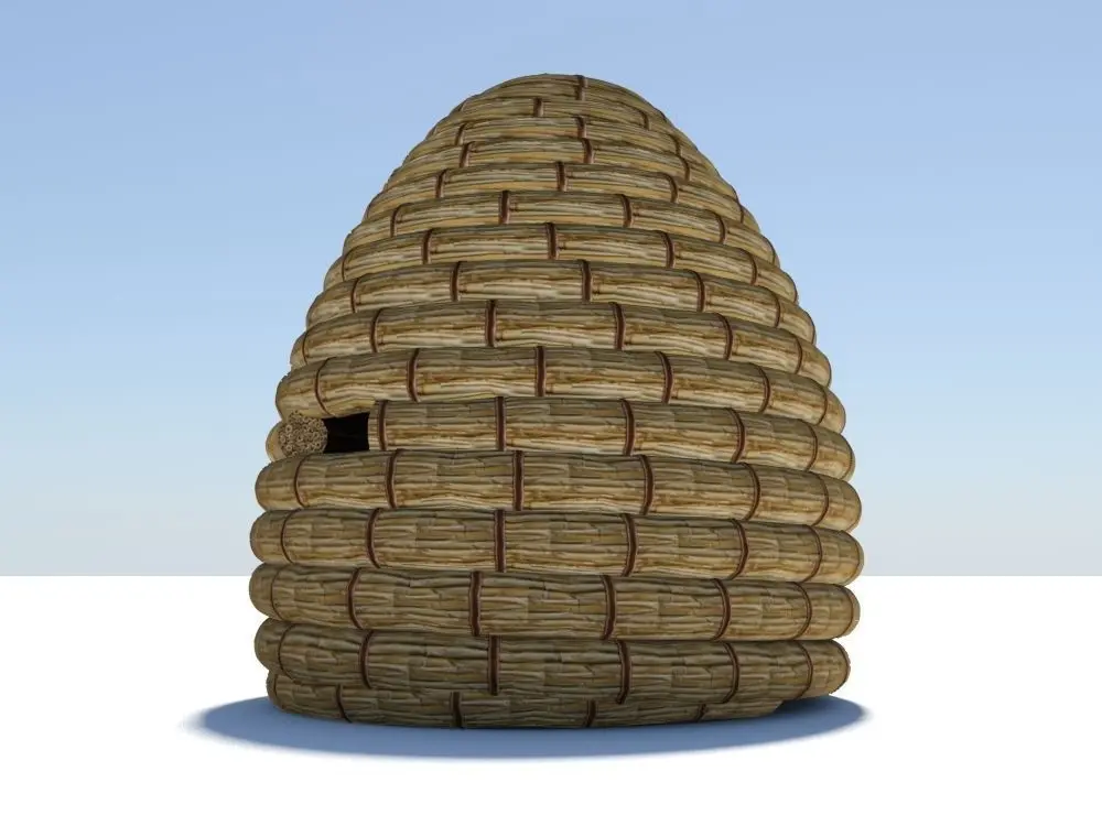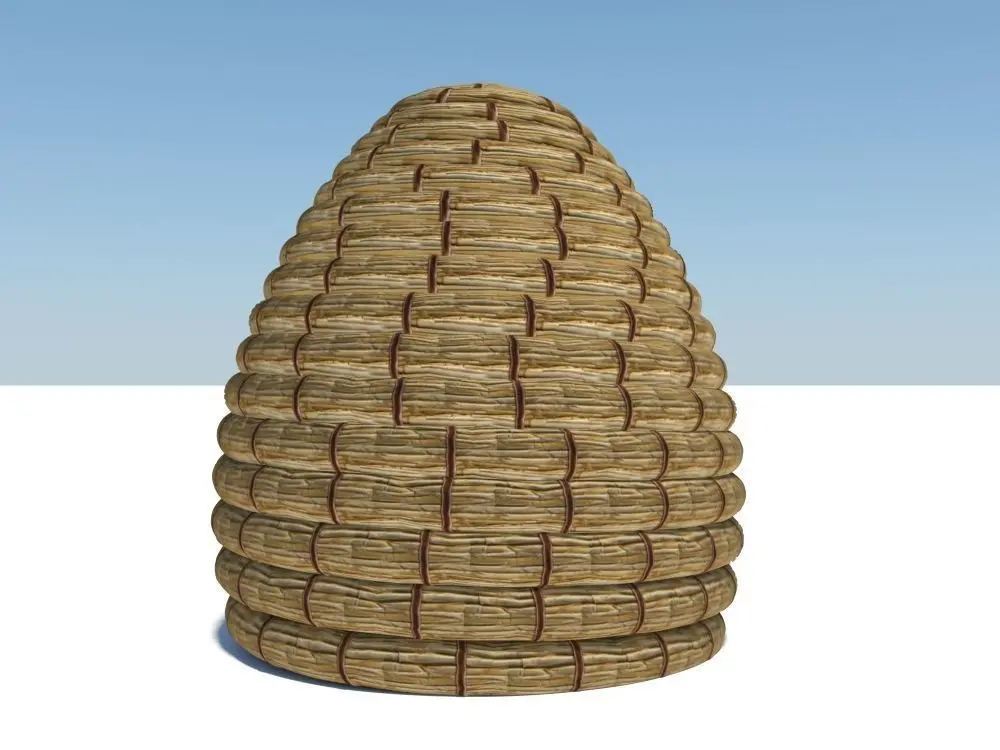 Low-poly bee skep for traditional bee keeping. A skep is a domed basket to house honey bees. European beekeepers switched from hollowed out logs to straw skeps around 800 AD. It’s made from all natural material like straw or hay bundles that are wrapped around a hollow dome. These bundles are stitched together with blackberry cane, which was split in half first. A slit of about 15 cm enables bees to enter and exit the structure.