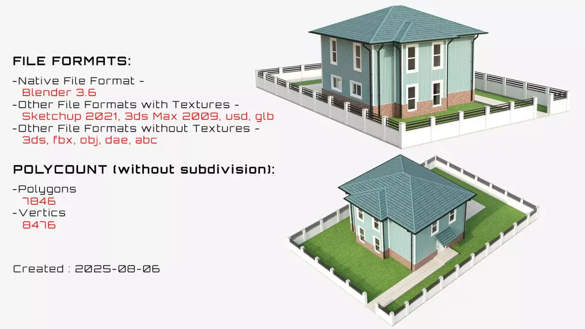 BLEND (Blender, filesize: 1.75 MB), OBJ (OBJ, filesize: 154 KB), FBX (Autodesk FBX, filesize: 254 KB), MAX (Autodesk 3ds Max, filesize: 1.79 MB), GLTF (glTF, filesize: 4.89 MB), DAE (Collada, filesize: 3.22 MB), JPG (JPG, filesize: 6.52 MB), ABC (Alembic, filesize: 200 KB), 3DS (3D Studio, filesize: 137 KB), SKP (Sketchup, filesize: 1.88 MB), USD (USD, filesize: 1.37 MB)