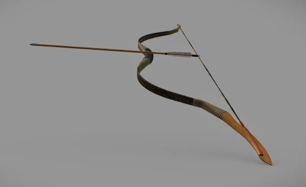 A traditional Mongolian recurve bow including arrow. Unwrapped UVs, non-overlapping UVs, low-poly and ready for game engine implementation and rigging. Includes 4096x4096 texture maps (albedo, gloss, specular, normal, ambient occlusion and opactiy).