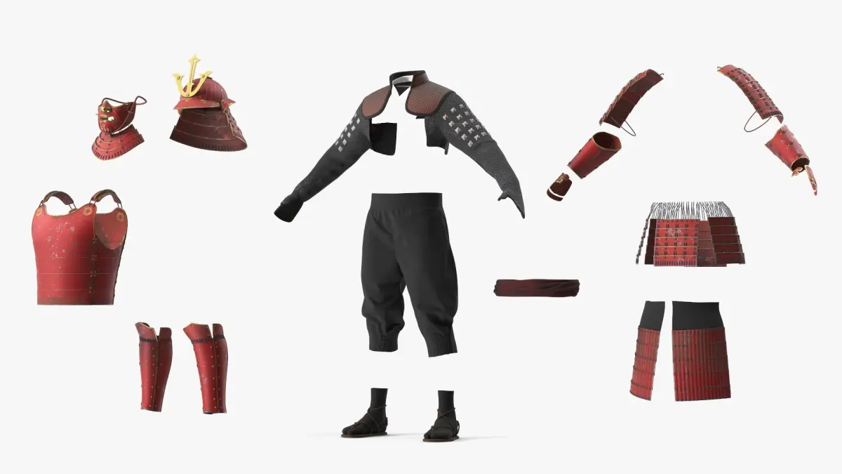Traditional Japanese Yoroi Armor with Mask Red Old is a three-dimensional model of full body armor of Japanese samurai of Sengoku period.