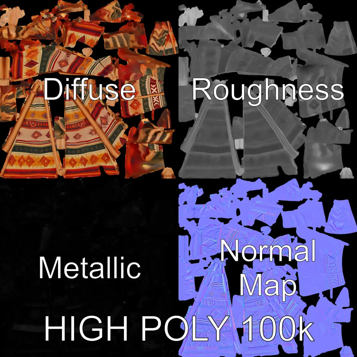 This 3D model pack features a traditional native tent with vibrant, colorful patterns, perfect for use in animated films, games, virtual reality environments, or cultural exhibits. Each model is available in three detail levels suitable for mobile, environment, and production rendering. Textures are fully PBR with a resolution of 4096x4096, supporting Diffuse, NormalMap, and reflection/roughness/metallic maps for all modern rendering engines. Models are accurately unwrapped with no overlapping UVs. Ideal for adding authenticity and cultural richness to your projects. Please like and comment if you enjoy this model. The first image is the reference used for creating the 3D model. It is important to carefully evaluate the quality of the model by examining the preview images that display the topology and polygonal mesh. These previews (WIRE and WEB 3D Preview) clearly demonstrate how accurately the model matches the original reference and how well the geometry has been executed.