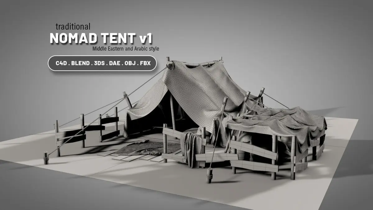 nomadtent1(SOURCE).C4D (R19) is the main file for Cinema 4D users. No textures or objects were baked. This needs TEX folder for texturing.
