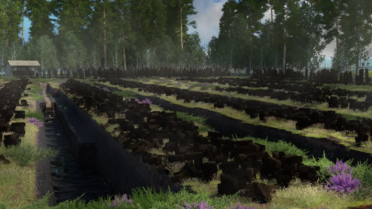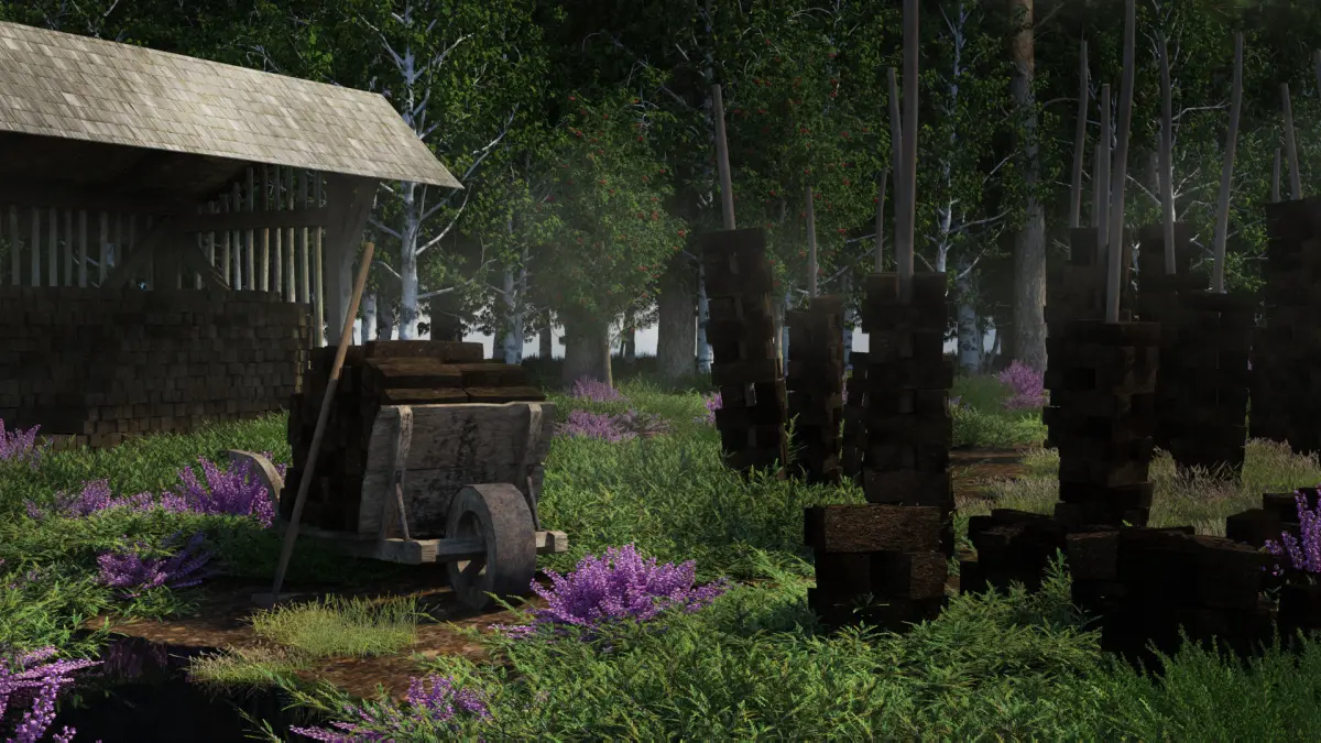 Low-poly historical accurate reconstruction of traditional peat or turf gathering trenches, pieces and tools. Turf was (and still is in some regions) used for alternative fuel for heating and cooking. In Germany it was gathered traditionally by hand at least until the 1970s. It can be gathered in wetlands. Trenches usually reached a depth of about 2 m. Special tools were needed, for example a very stable wheelbarrow with extra wide wheels to not sink into the mushy ground or special shovels to prick out handy pieces of turf.