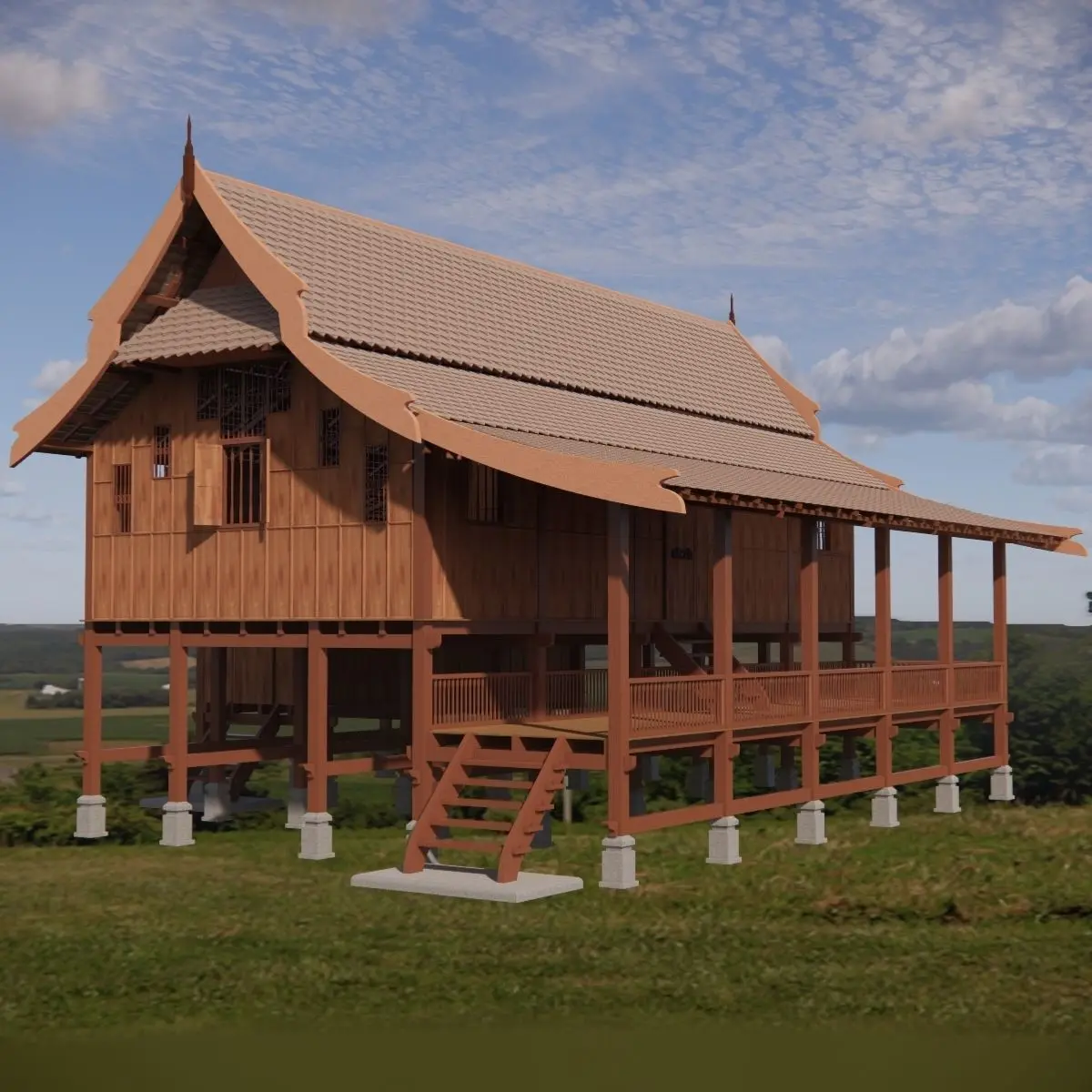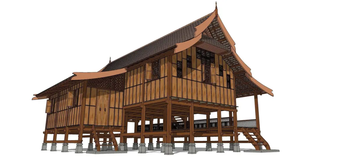 this 3d model is a traditional Malay house located in Terengganu,Malaysia, this house is known as Rumah Bumbung Panjang because of its roof. the roof is a gable roof sloping down with different degree angle creating a unique style and identity of malay houses. every malay houses will start built in a grid form. starting with 6 poles or tiang 6 to 12 poles ,tiang 12 and when the family is getting bigger the house will expand and can be up to 24 poles or tiang 24 .the roof is the most significant element for this house especially the tebar layar and the roof tile. it is usually built for middle class family and can be seen across the Malaysia peninsular. the structure is fully using a solid wood specifically the Cengal timber while the other parts use meranti timber. the 3d model was made and create in sketchup and rendered using enscape version 3.1. the outcome may vary depends on the software you are using. it is scaled 1:1 following the real dimension.