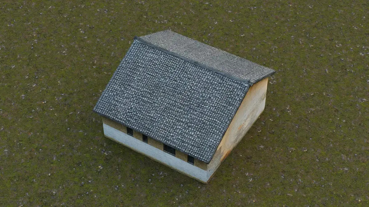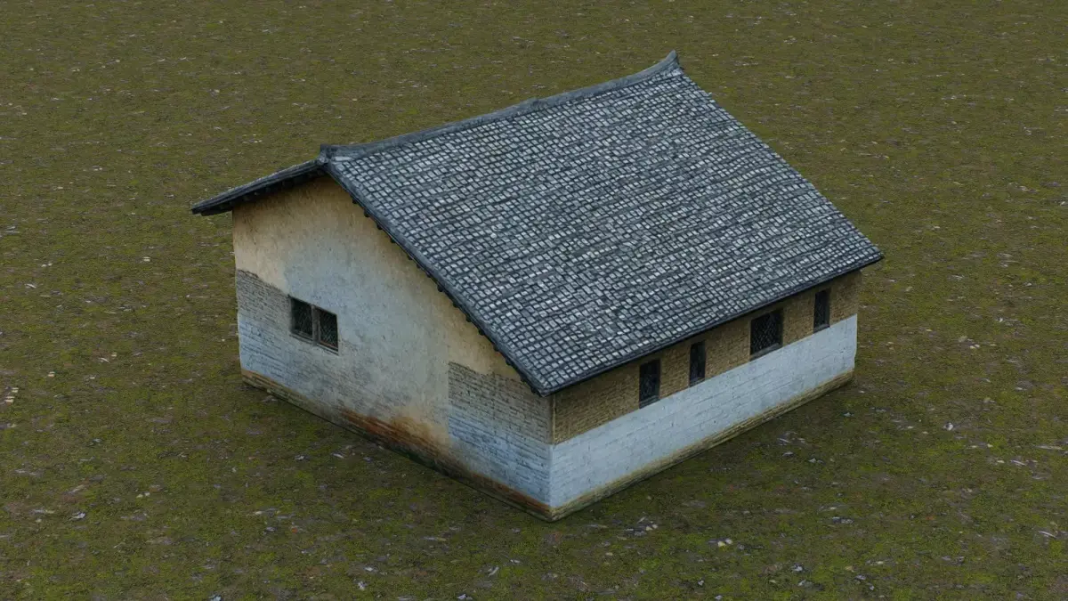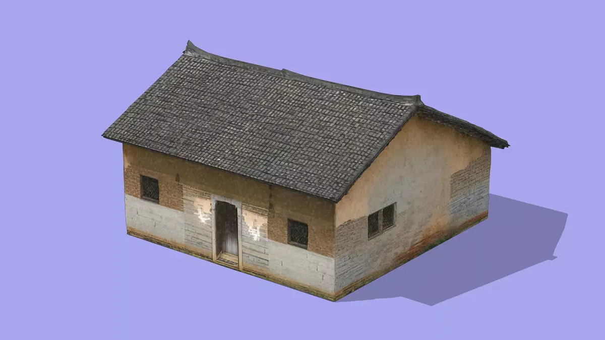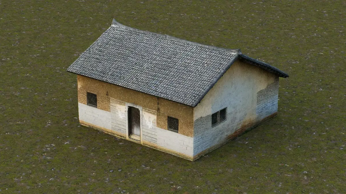 This 3D low-poly model portrays a traditional rural dwelling, showcasing the architectural style commonly found in historic countryside settlements. Featuring a gently curved tiled roof with upturned eaves, the house is constructed from weathered earthen and plastered walls, accented with white stone or stucco at the base. The structure includes a central wooden door and small barred windows, reflecting its modest, functional design. With visible signs of aging and natural wear, the model captures the authentic charm and resilience of rural residential architecture, ideal for historical reconstructions, game environments, or cultural simulations.