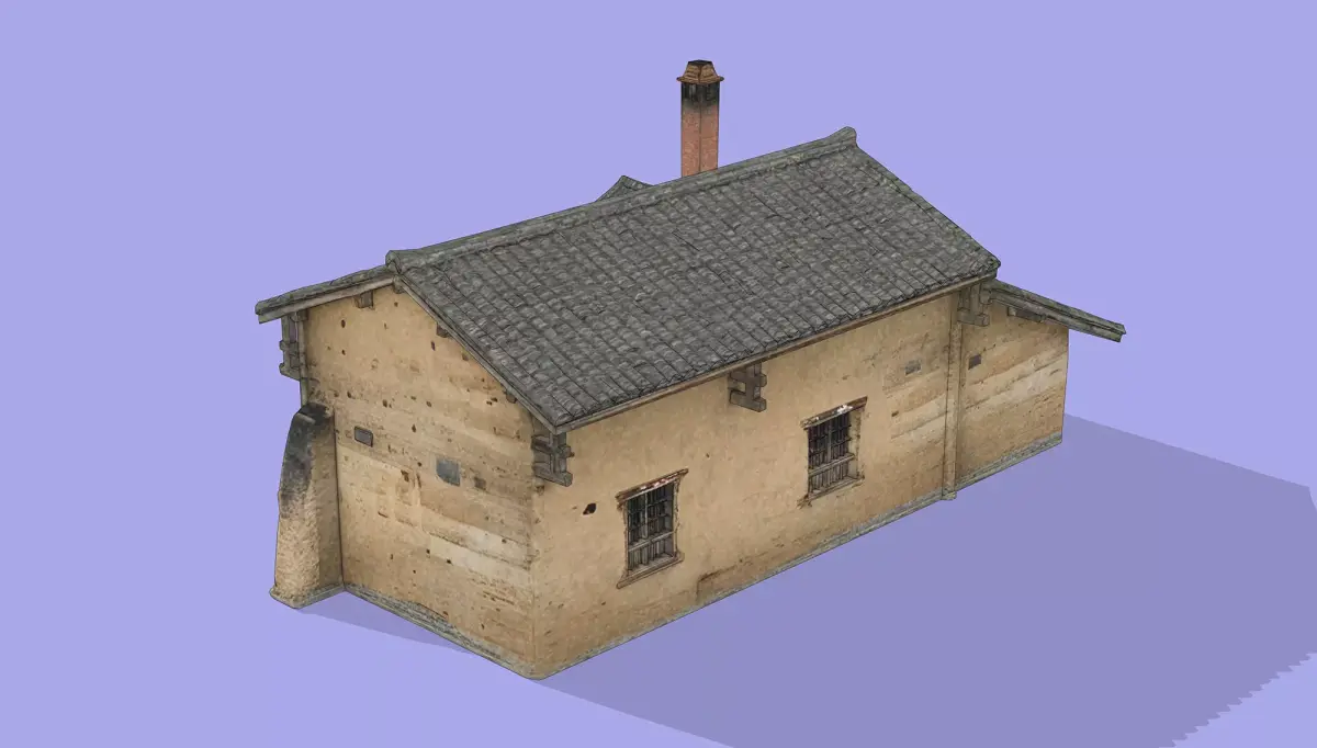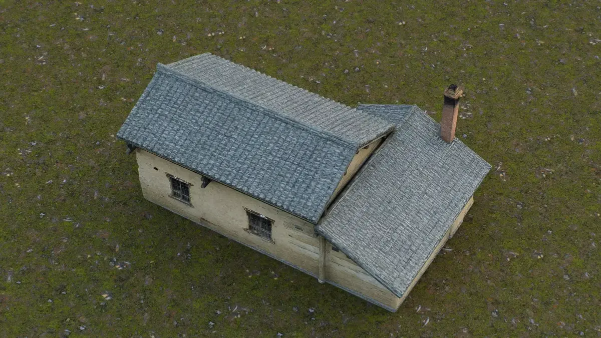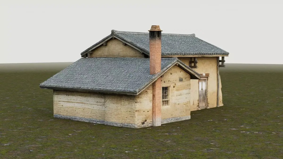 This 3D low-poly model represents a traditional rural dwelling, capturing the essence of modest countryside architecture. Constructed with weathered earthen walls and a gray tiled gabled roof, the house features a prominent brick chimney, wooden doors, and small barred windows, reflecting its functional design for agricultural communities. The model includes subtle signs of aging and wear, enhancing its authenticity and realism. Ideal for historical simulations, game environments, or architectural studies, this structure embodies the simplicity and resilience of rural residential buildings.