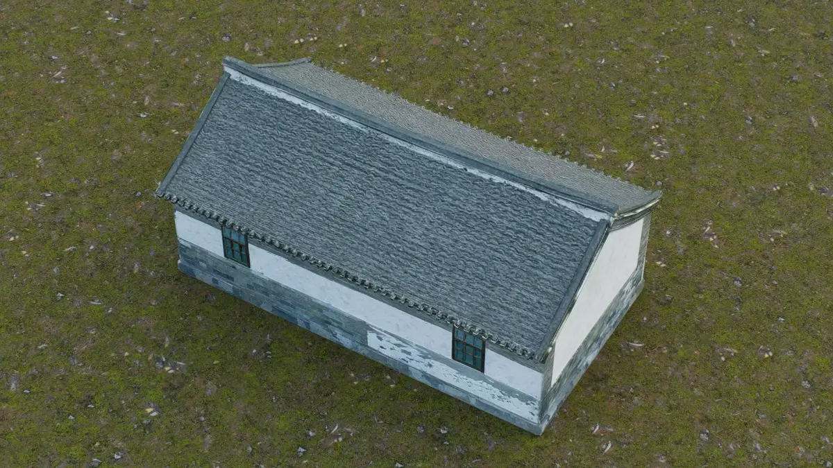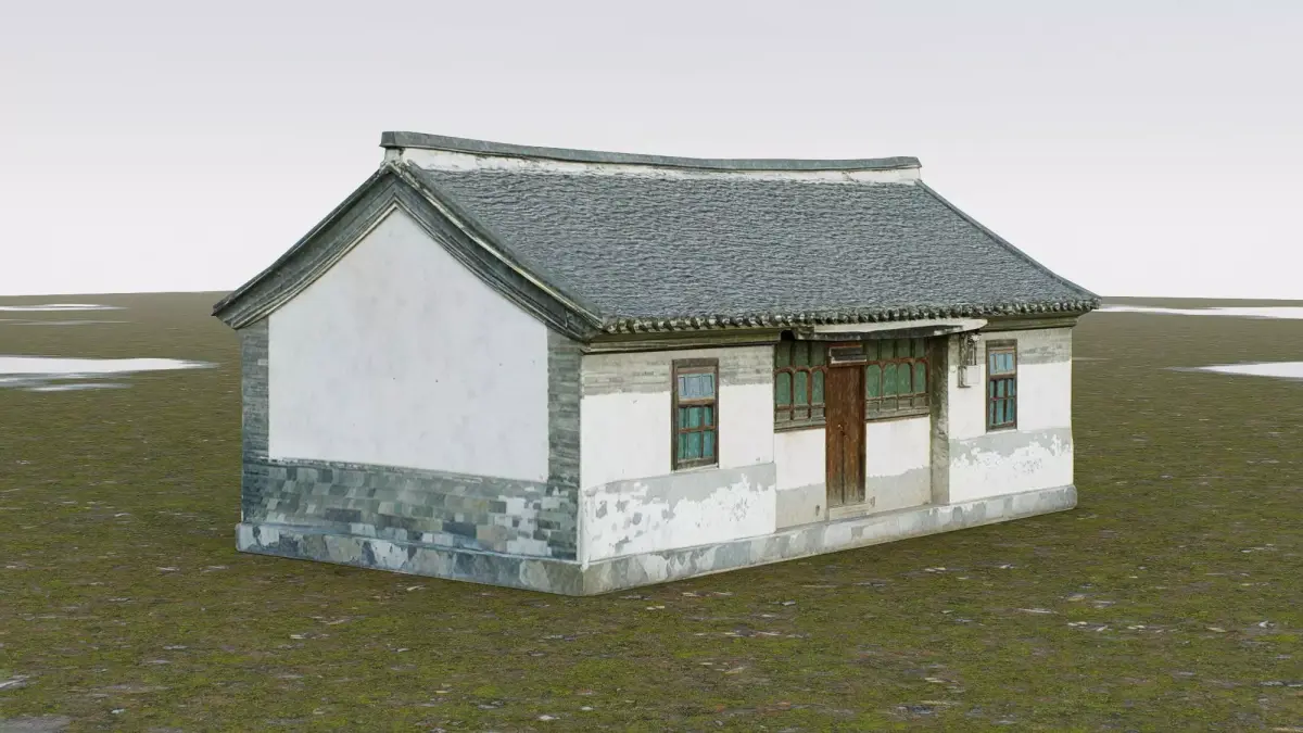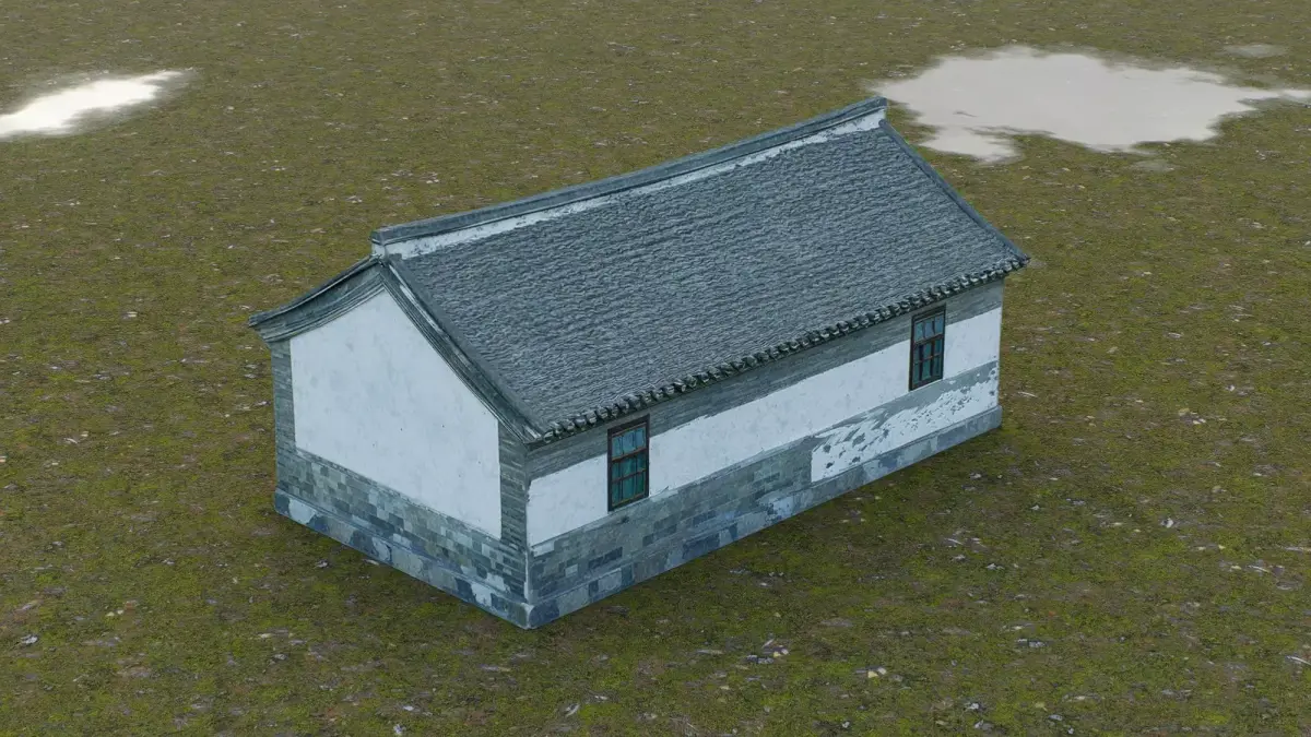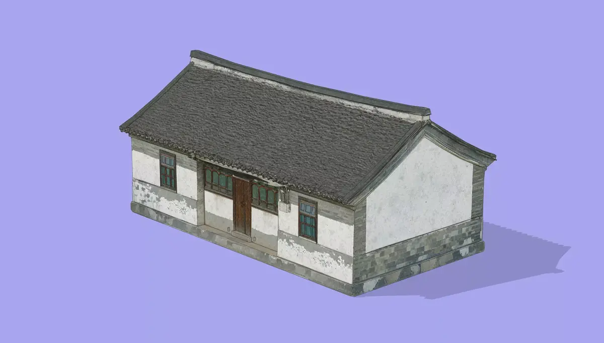This 3D low-poly model depicts a traditional single-story rural house commonly found in northern China, reflecting classic vernacular architecture. Featuring a gently curved tiled roof with upturned eaves, whitewashed walls with weathered brick detailing at the base, and wooden-framed windows and doors, the structure embodies a timeless aesthetic rooted in regional building traditions. The design emphasizes simplicity, durability, and harmony with the natural environment, making it suitable for use in historical reconstructions, cultural simulations, or game environments that require authentic rural Chinese buildings.