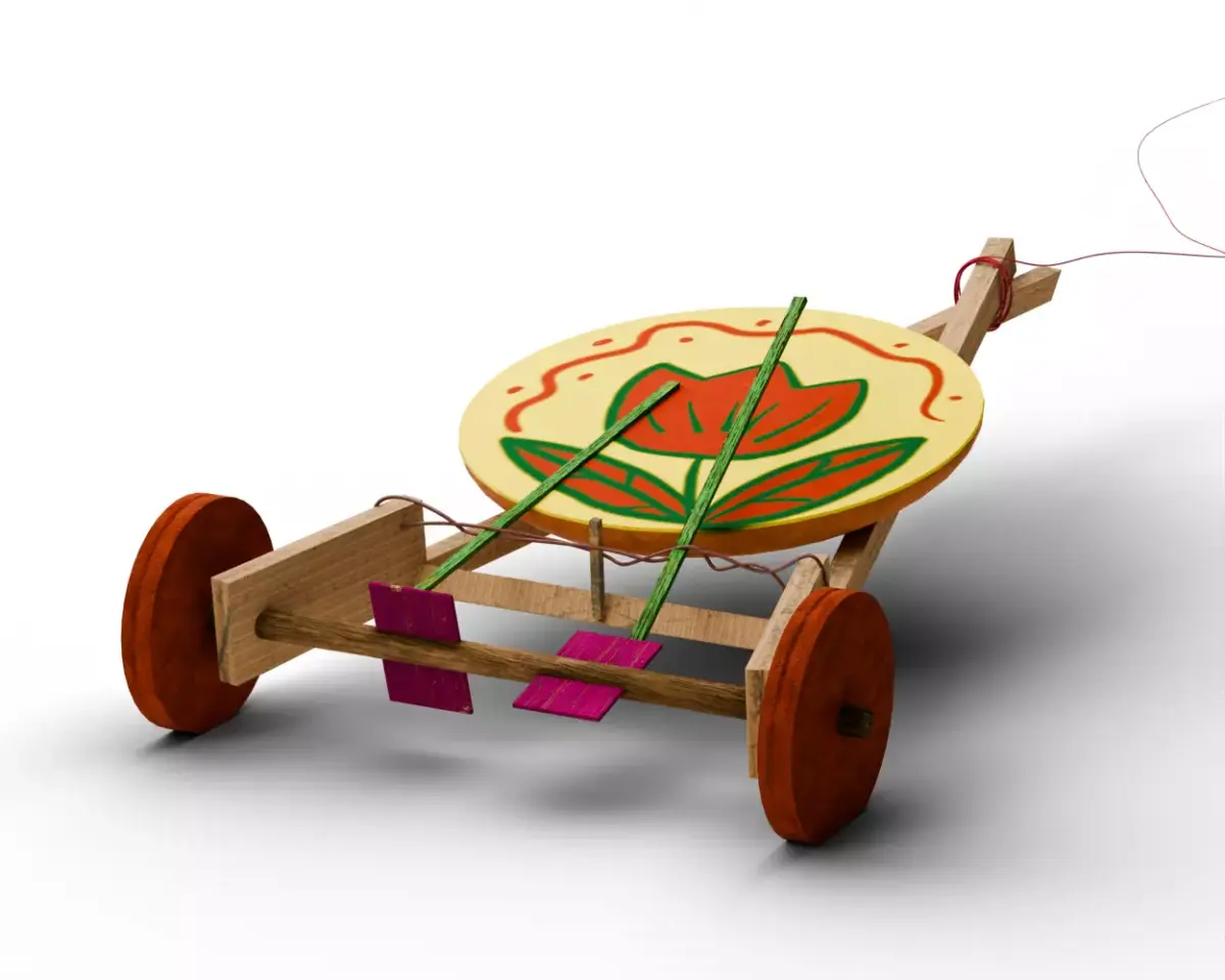- Materials: Clay (drum), Bamboo (frame/sticks), Wood (axle/wheels).