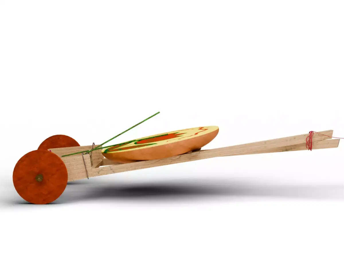 - Materials: Clay (drum), Bamboo (frame/sticks), Wood (axle/wheels).
