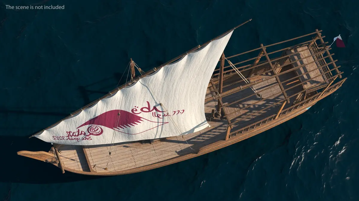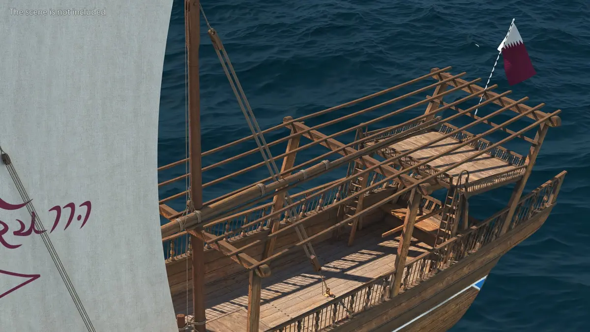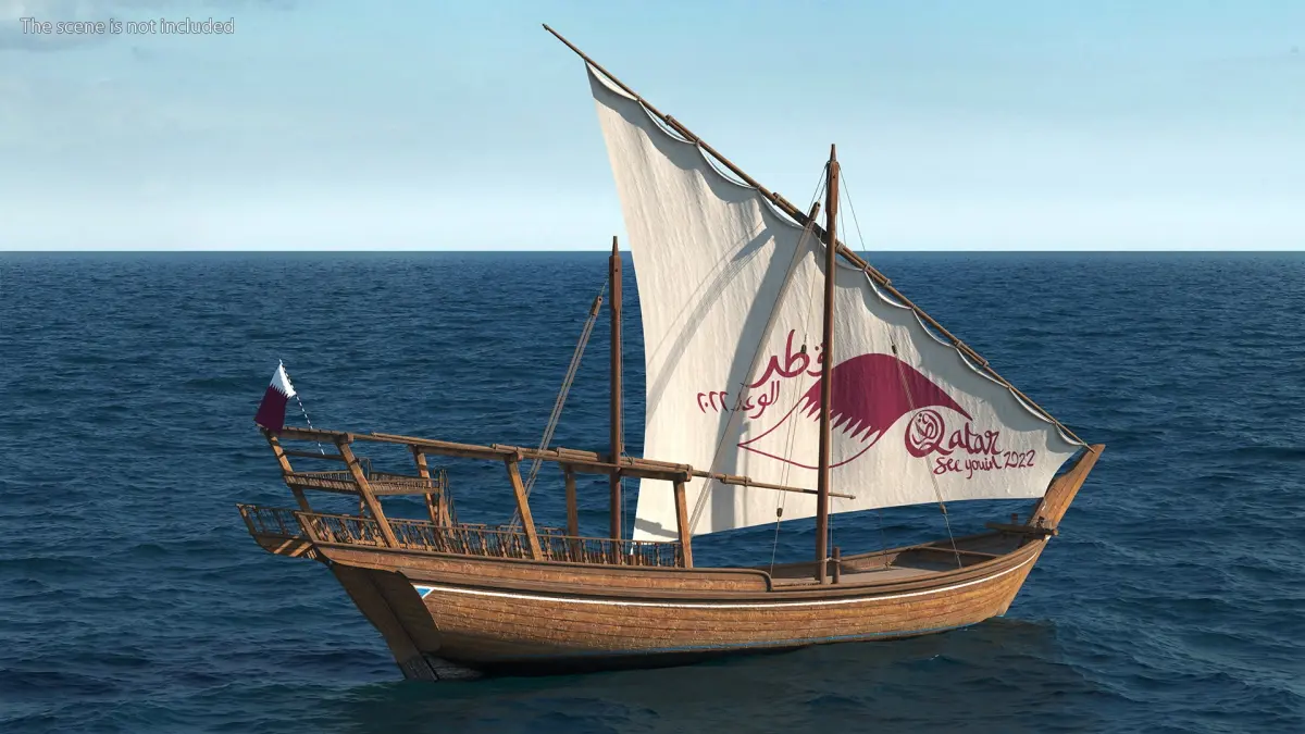 Traditional Wooden Qatar Boat is a three-dimensional model of a dhow wooden oriental sailboat with masts and rigging sails.
