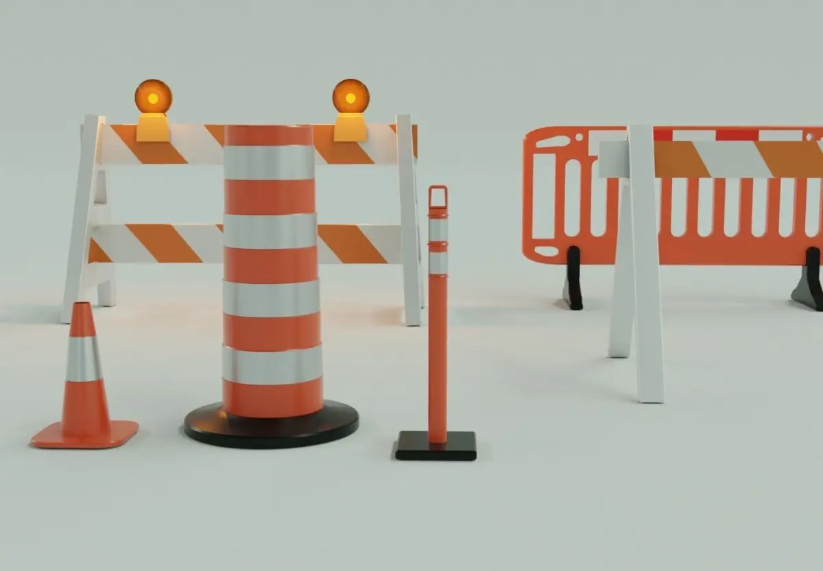 1x Traffic cone1x Traffic drum (construction barrel)1x Delineator1x A Shaped Barrier with lights1x Pedestrian Plastic Barrier1x Road Barrier