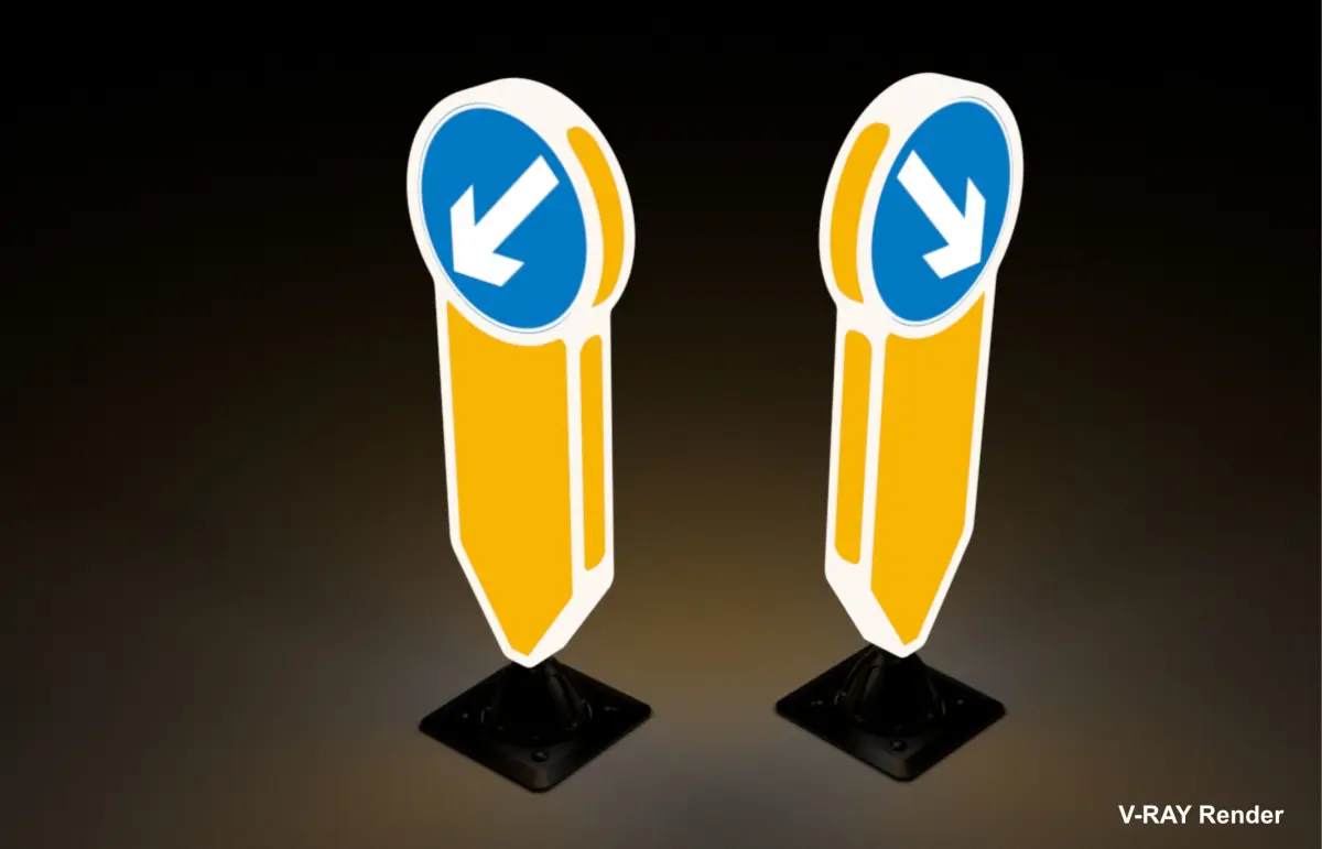 Here we have one Traffic Island Bollard of the Retroflective Self Righting Type as found in the UK & Europe.You can change it from two sided to single sided by changing the emissive panels to plain as reqiured , see images for examples. You can also switch from White plastic surround to emissive white(Illuminated) or black plastic -The choice is yours!