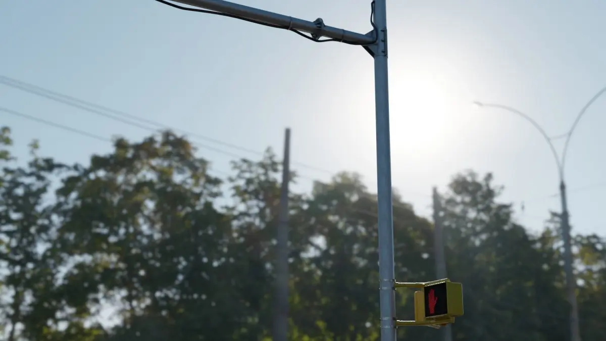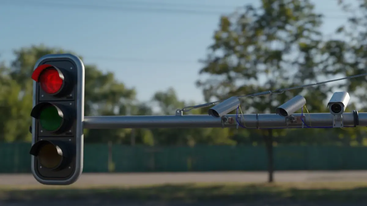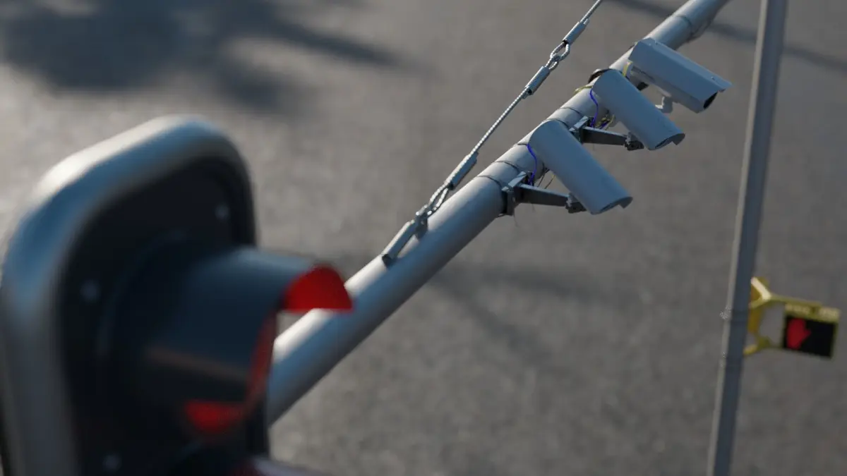 A traffic-light model with walk signals and cameras attached to a street-side pole.