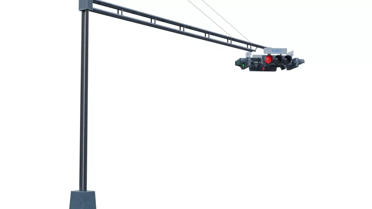 This is a 3D model of a Japanese intersection traffic light. Unlike lights mounted on the sides of roads, this one is attached to a beam right over the middle of the intersection. This central position makes it much easier for all drivers to see whether the light is red, yellow, or green.