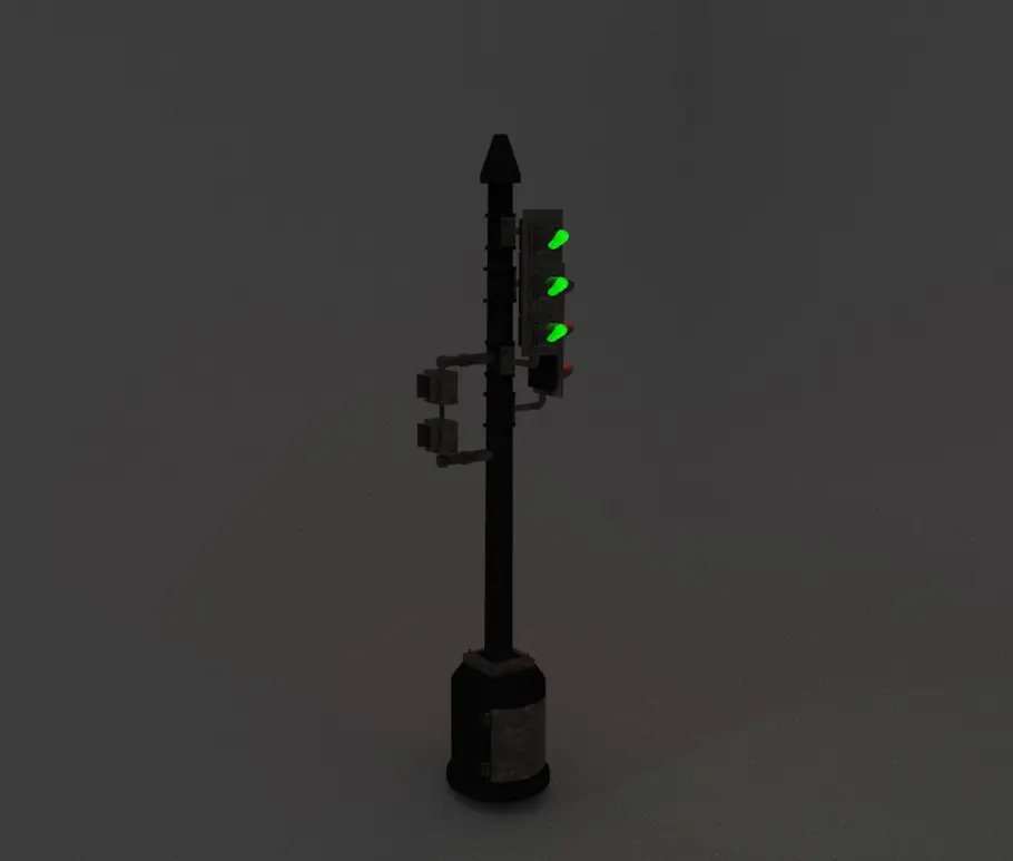 This 3D model feels like a character straight out of a dystopian, steampunk-inspired world—a sturdy, no-nonsense traffic sentinel standing tall at the crossroads of an industrial city. Its textured, weather-beaten body tells the story of years spent braving harsh weather and relentless smog.The glowing green lights on one side exude a calm, steady demeanor, as if signaling the way forward with quiet confidence. On the other side, the red lights feel stern, almost protective, like a vigilant guardian stopping those who might rush ahead too recklessly. The pointed caps on the red lights give it a bit of personality—sharp and precise, not to be ignored.The smaller details, like the rugged box near the base and the piping running up its spine, make it feel more grounded, like it’s been pieced together with care to serve its purpose. It’s not just a traffic light—it’s a silent, dependable guide in a world that never stops moving.