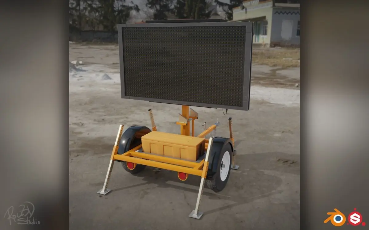 This traffic message sign board (typically used in construction, traffic, and pedestrian safety settings) has 4K image textures. Includes image textures to create 3 different messages (Road Closed Ahead; Road Work Ahead; Don't Drink & Drive).