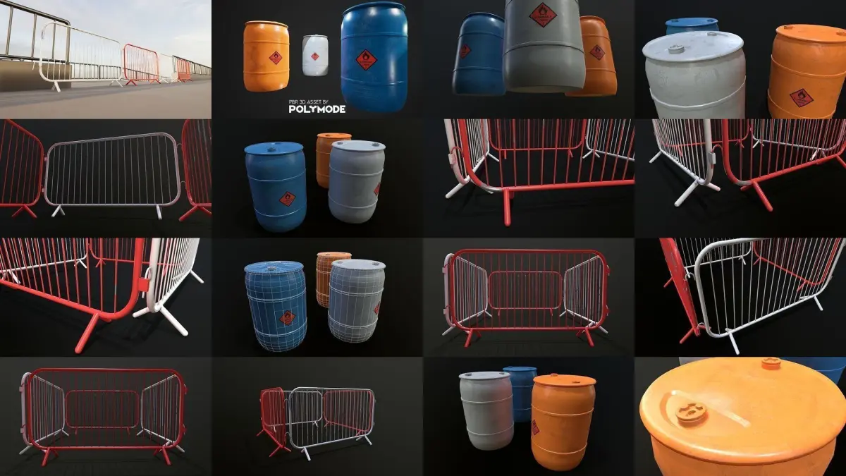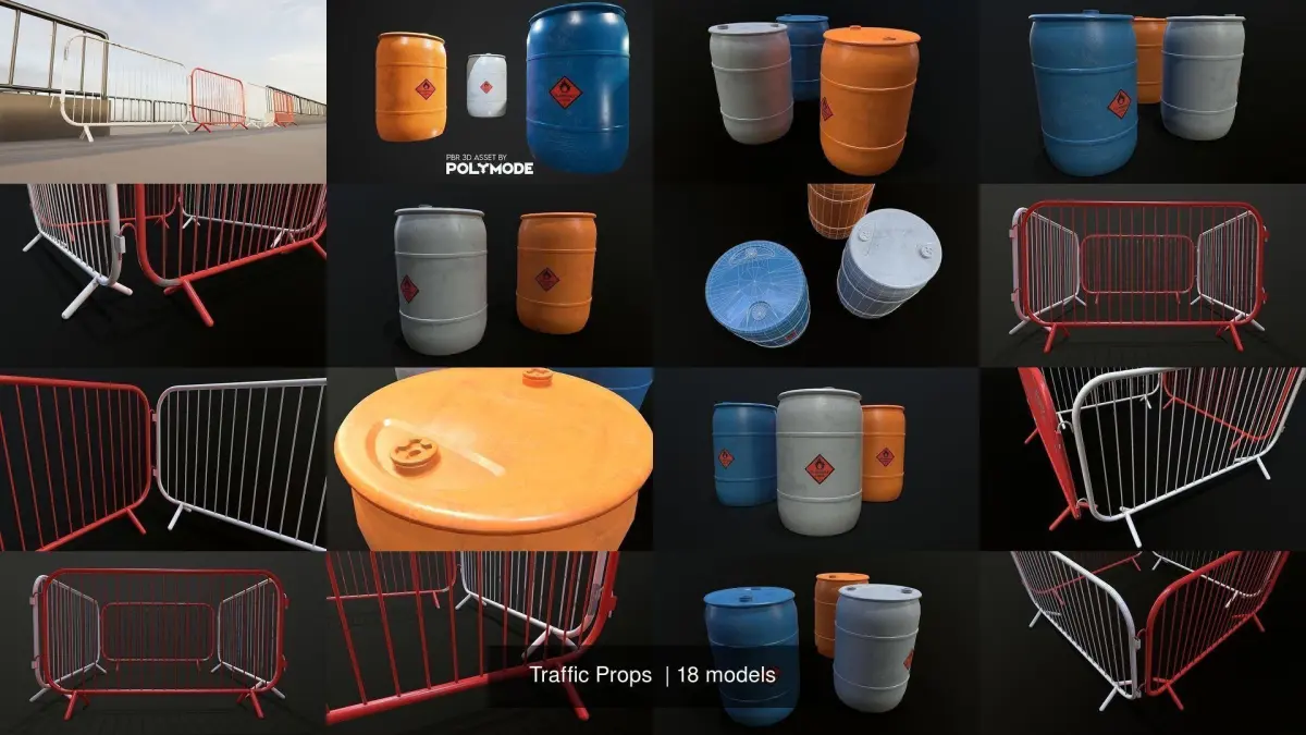 Collection of realistic traffic barriers. Different color variations, unique models. *Clean/tear and wear textures *. Barriers, Road Cones, Traffic Lights, Fencing, Parking Stops, etc.