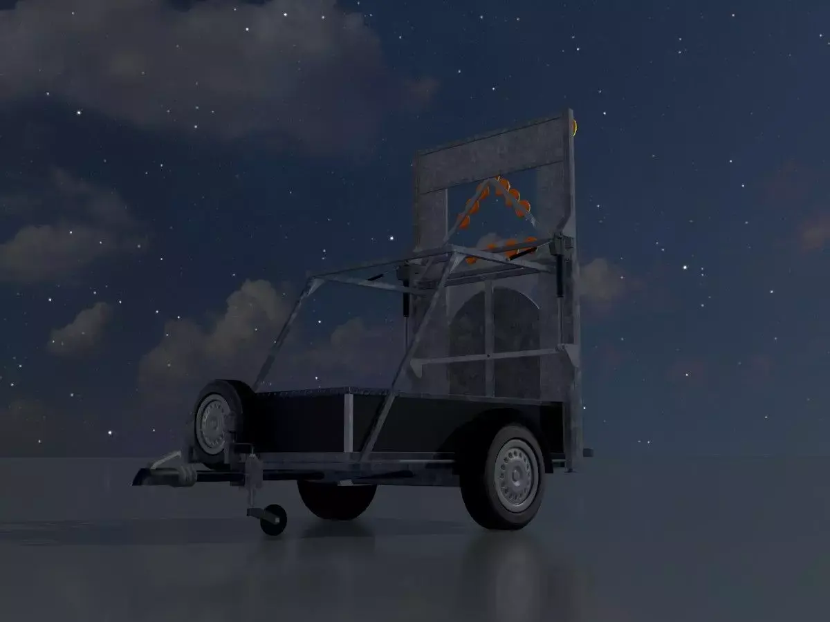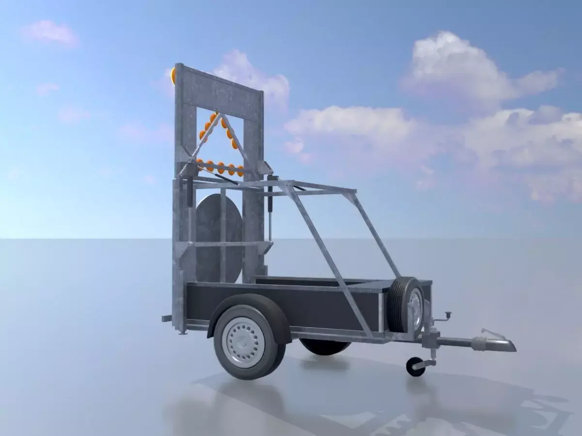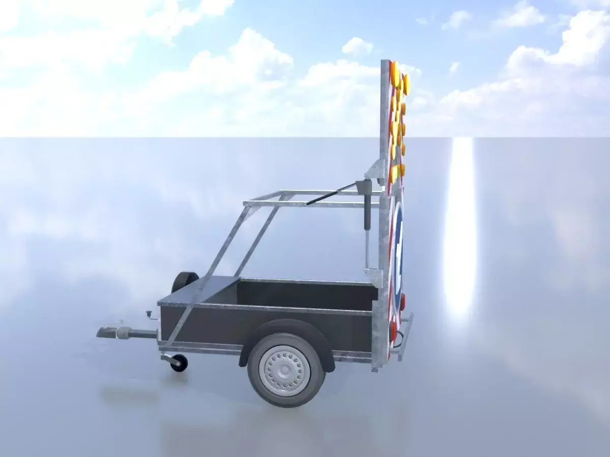 - Here you can see the 3D model of a mobile barrier sign with left-turning illuminated arrow and a sign size of 3600 x 2200 mm.