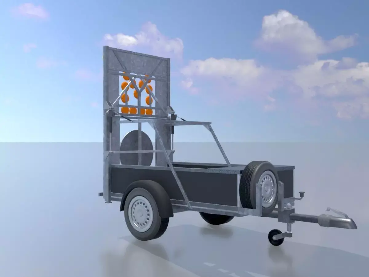 - Hier sehen Sie das 3D-Modell einer fahrbaren Absperrtafel mit einem linksweisenden Leuchtpfeil und einer Tafelgröße von 2.500 x 1.700 mm.