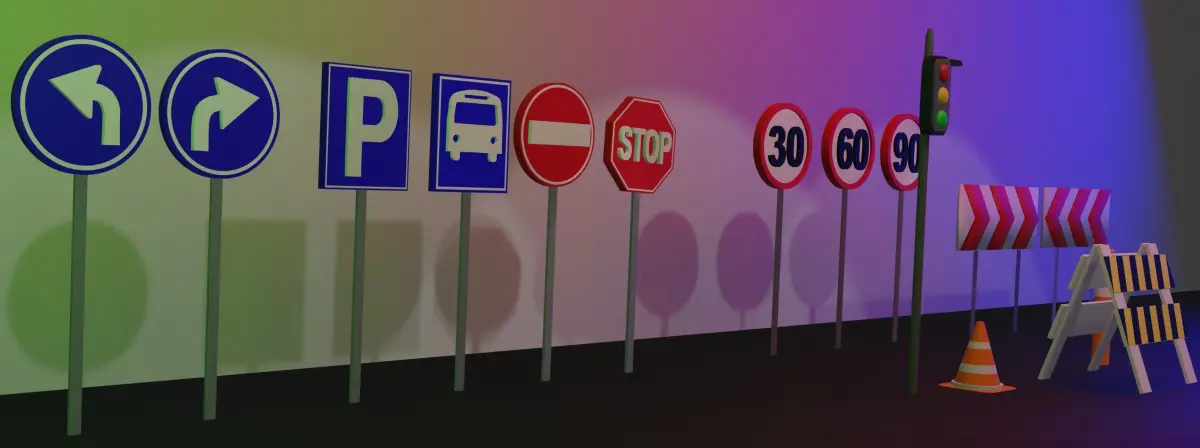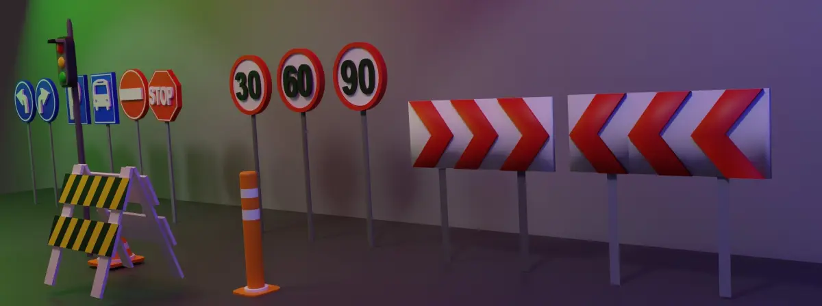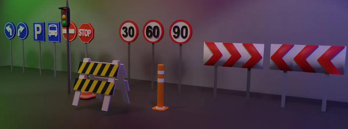 etc. Includes: 30 speed limit, 60 speed limit, 90 speed limit, stop sign, bus stop sign, parking sign, right direction sign, left direction sign, traffic light, traffic cone, traffic roller, traffic barrier, right turn sign, left turn sign. You can make the objects smaller or larger if you want. You can change the number of speed limits . If you want different signs, you can reach me from this e-mail.