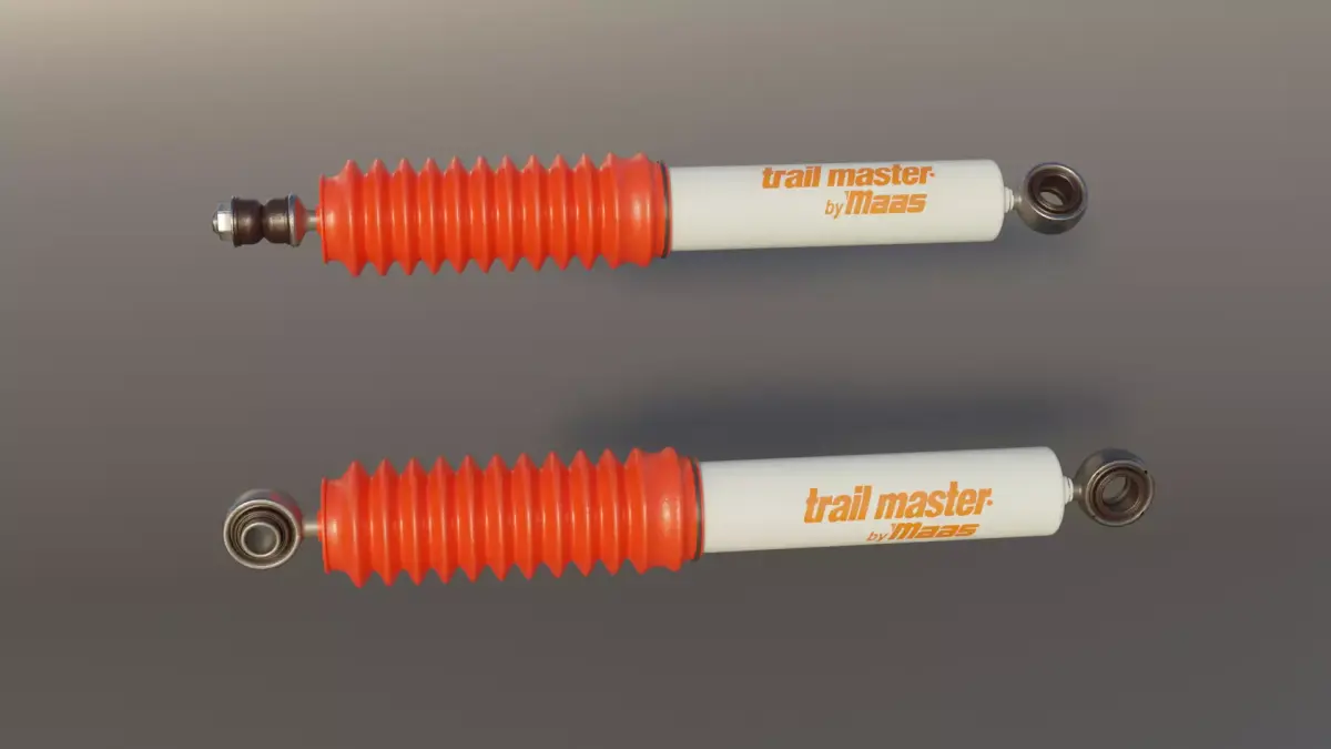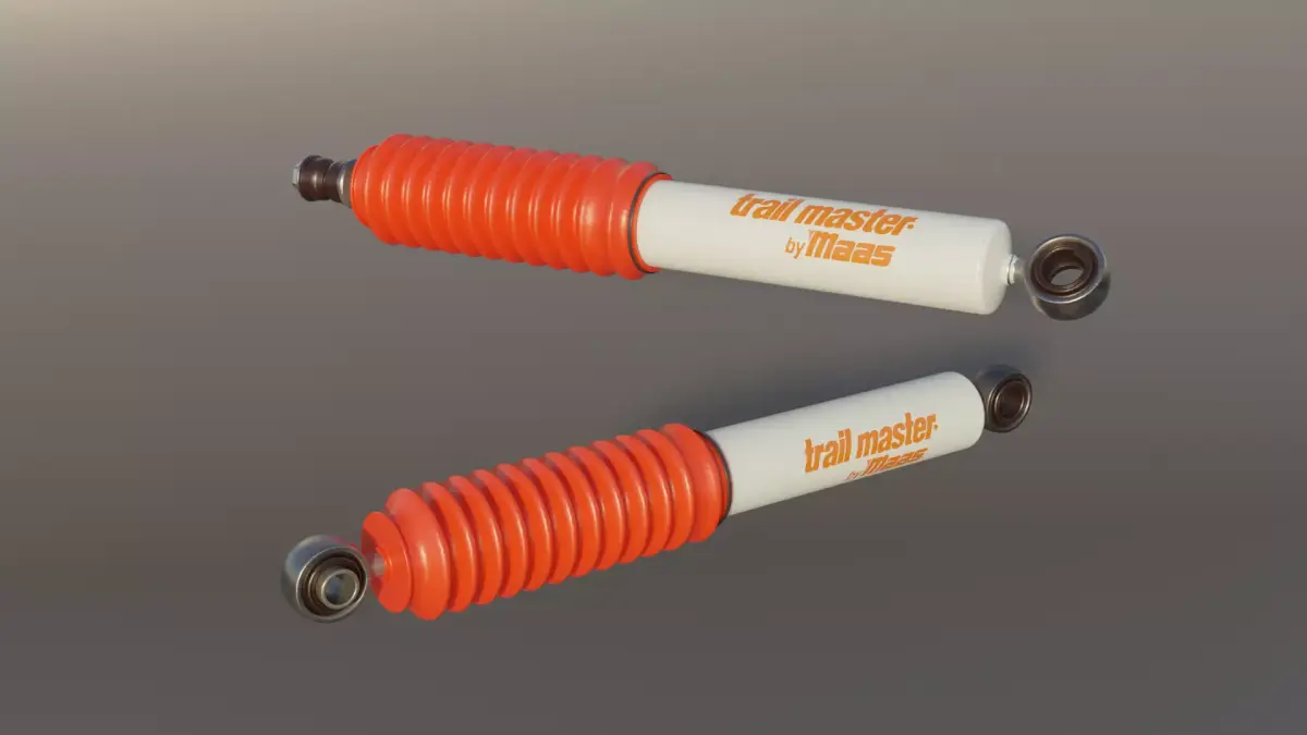 High-quality 3D model of the Trail Master by Maas shock absorber, designed with precision and attention to detail. The model was created in Blender and textured in Substance Painter, featuring 4K textures that provide excellent visual fidelity and realistic surface detail.