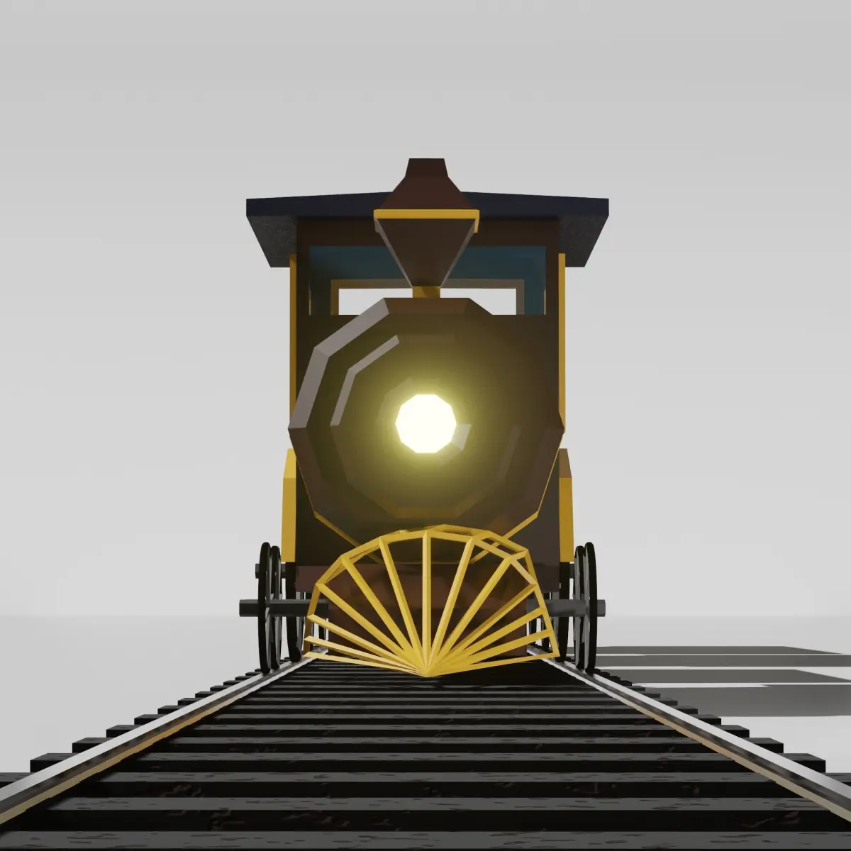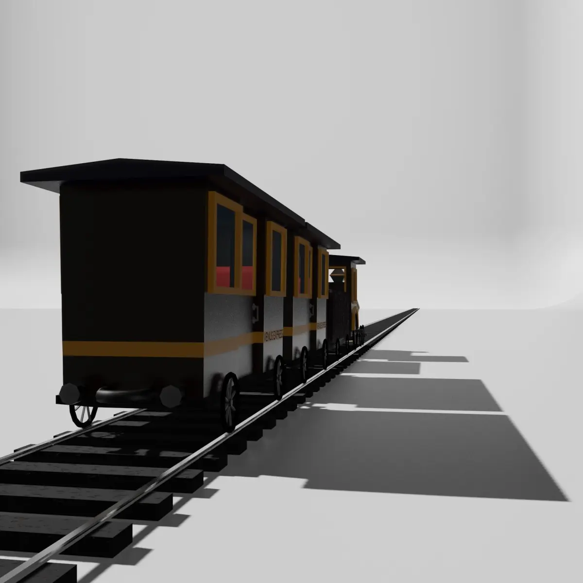 A vintage fashioned brown train with yellow stripes. The train has a steam engine, a coal cart and two coaches. The whole train is given materials and rigged. The train has 9 pairs of wheels(rigged). The coaches have two luxurious red seats facing each other. The train also has a headlight in the front of the boiler. The model also comes with rails which can be arrayed.